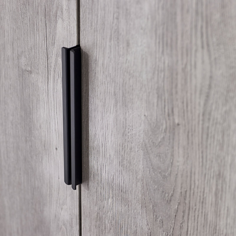 - Modern grey oak finish with contrasting black legs and handles.