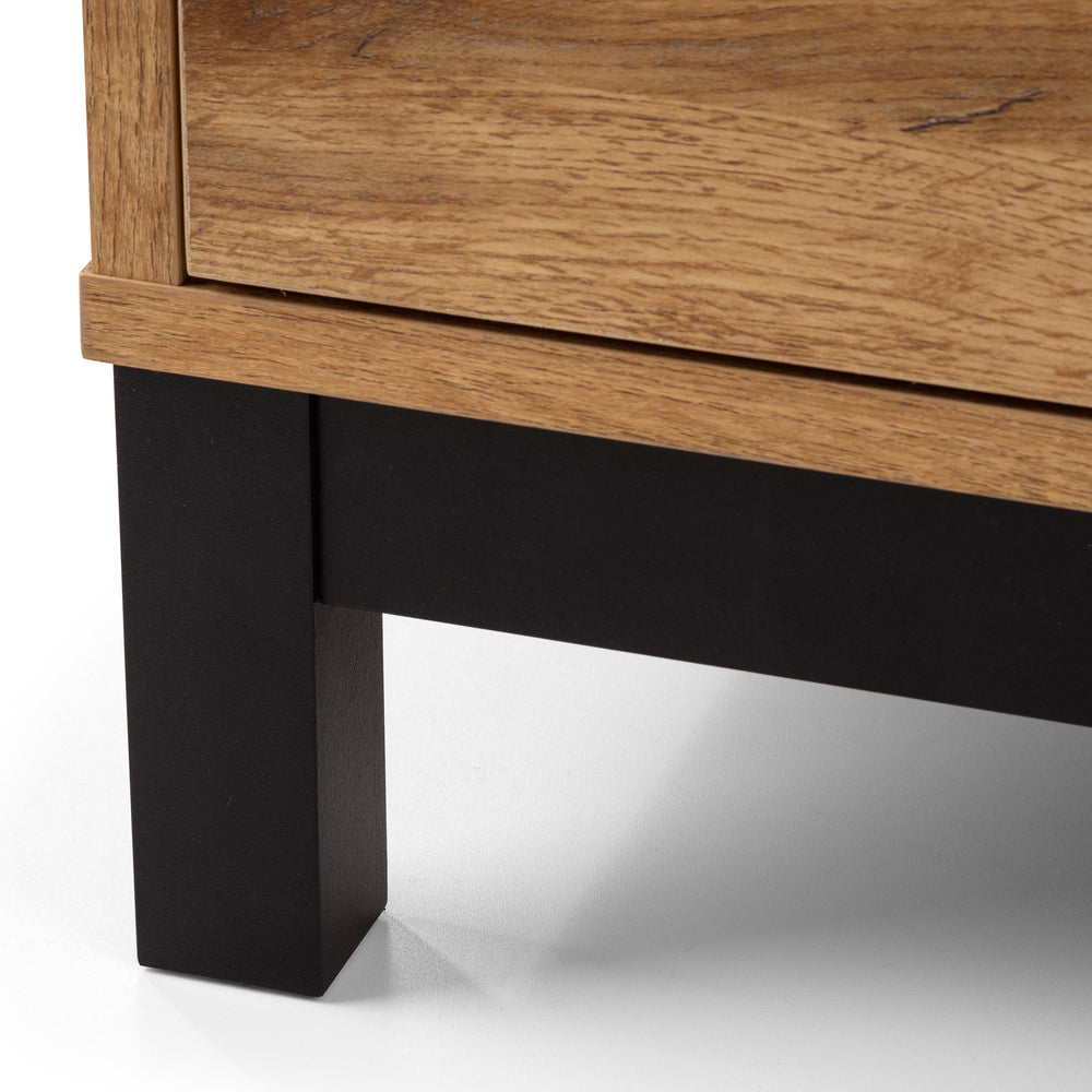 - Modern oak finish with contrasting black legs and handles.