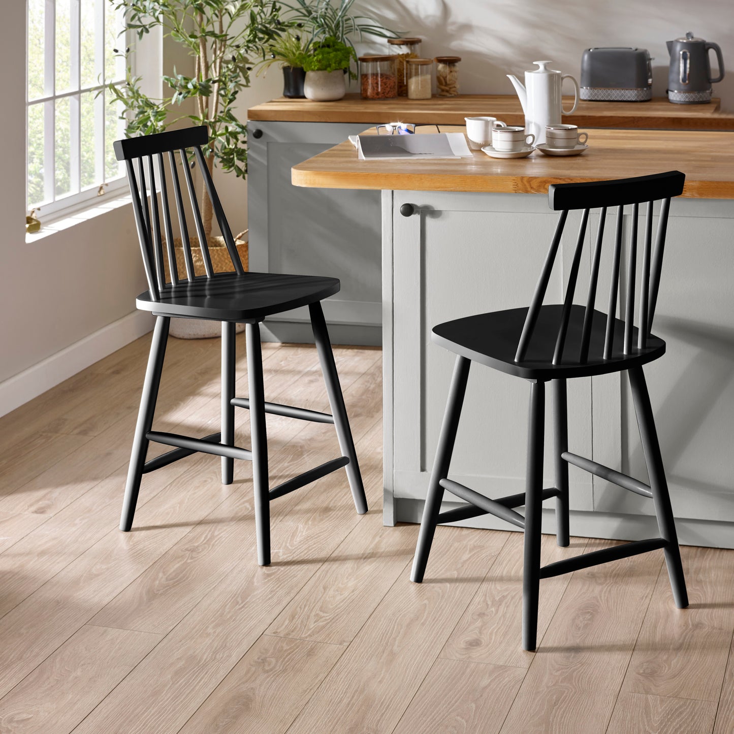 "The Alassio Bar Stool blends classic design with everyday practicality. Finished in a sleek black colour, its gently curved backrest and spindle detailing bring a fresh, timeless feel to kitchen islands and breakfast bars.