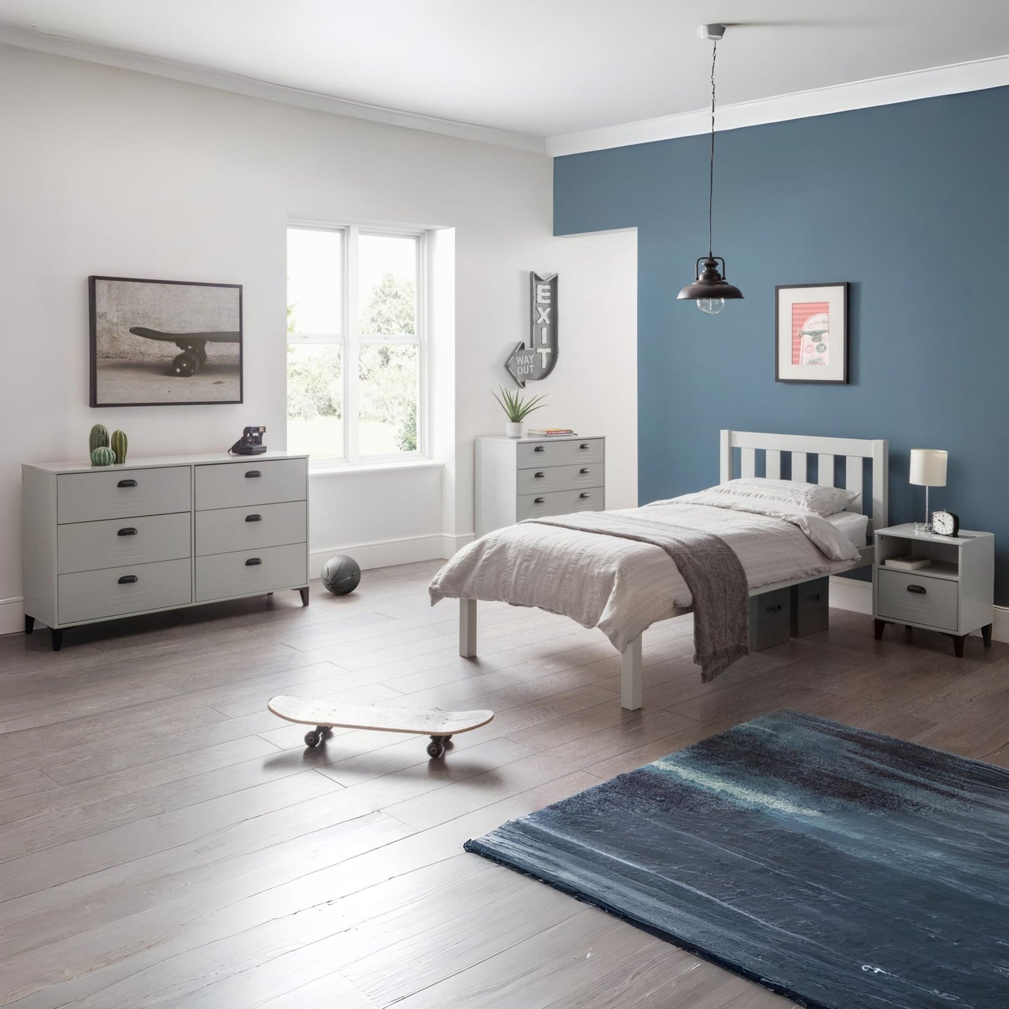 Create a unique industrial vibe with the Lakers Locker Bedroom Collection. Crafted from solid pine and MDF in a metal effect grey lacquer with black metal effect legs and handles, the Lakers range features ventilation detailing to resemble a vintage locker effect. Perfect for a range of modern, retro bedrooms.