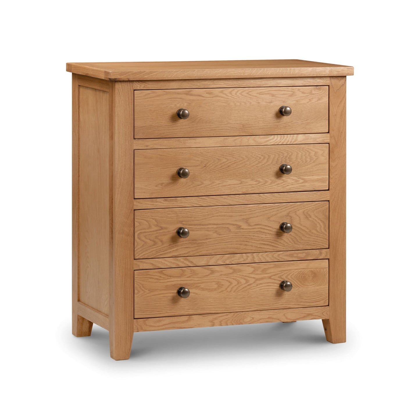 Marlborough is a bedroom range with a classic and timeless design, beautifully constructed using the finest White Oak and Oak Veneers and which complements both traditional and contemporary decor beautifully. The Marlborough Oak 4 Drawer Chest has a 30mm chunky top, clean lines and a sumptuous waxed finish. Drawers are constructed with Dovetail Joints