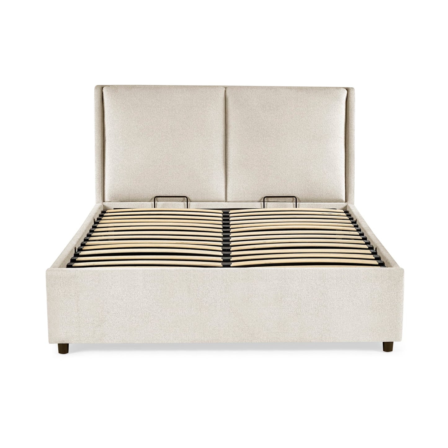 Bring refined style and practical function to your bedroom with this beautifully upholstered ottoman bed. Wrapped in soft beige fabric, it features a smooth, padded headboard with subtle split-panel detailing, offering support and elegance to your bedroom. The low footboard and clean frame keep the silhouette sleek, while the lift-up base reveals generous underbed storage, perfect for bedding, clothing, or everyday essentials. Blending smart design with timeless appeal, this upholstered bed frame suits both minimalist and cosy interiors. Assembly required. Mattress sold separately.