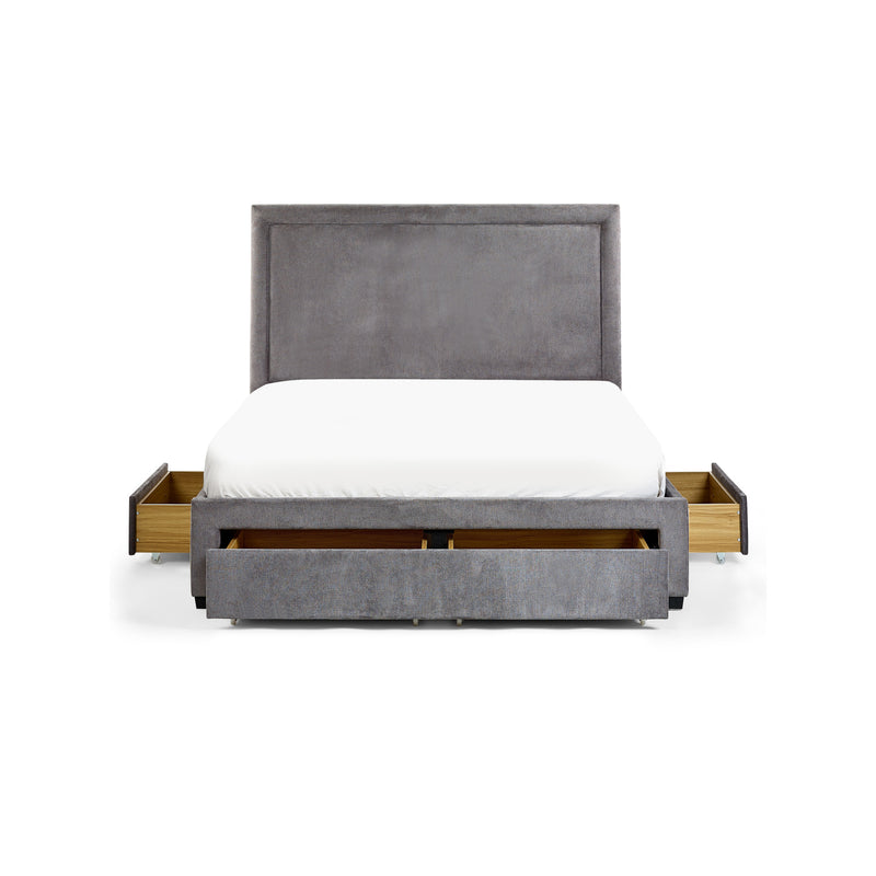 Indulge in luxurious style and functionality with this 135cm grey 4 drawer bed. Beautifully crafted with a sleek grey upholstered frame, it features a refined headboard outline that adds a sophisticated touch to your bedroom. The plush, padded headboard ensures ultimate comfort, while the four spacious under-bed drawers offer discreet storage to keep your space organised. Blending modern elegance with practical convenience, it effortlessly enhances your room. With minimal assembly required, you can effortlessly transform your space into a lavish retreat. Mattress sold separately.