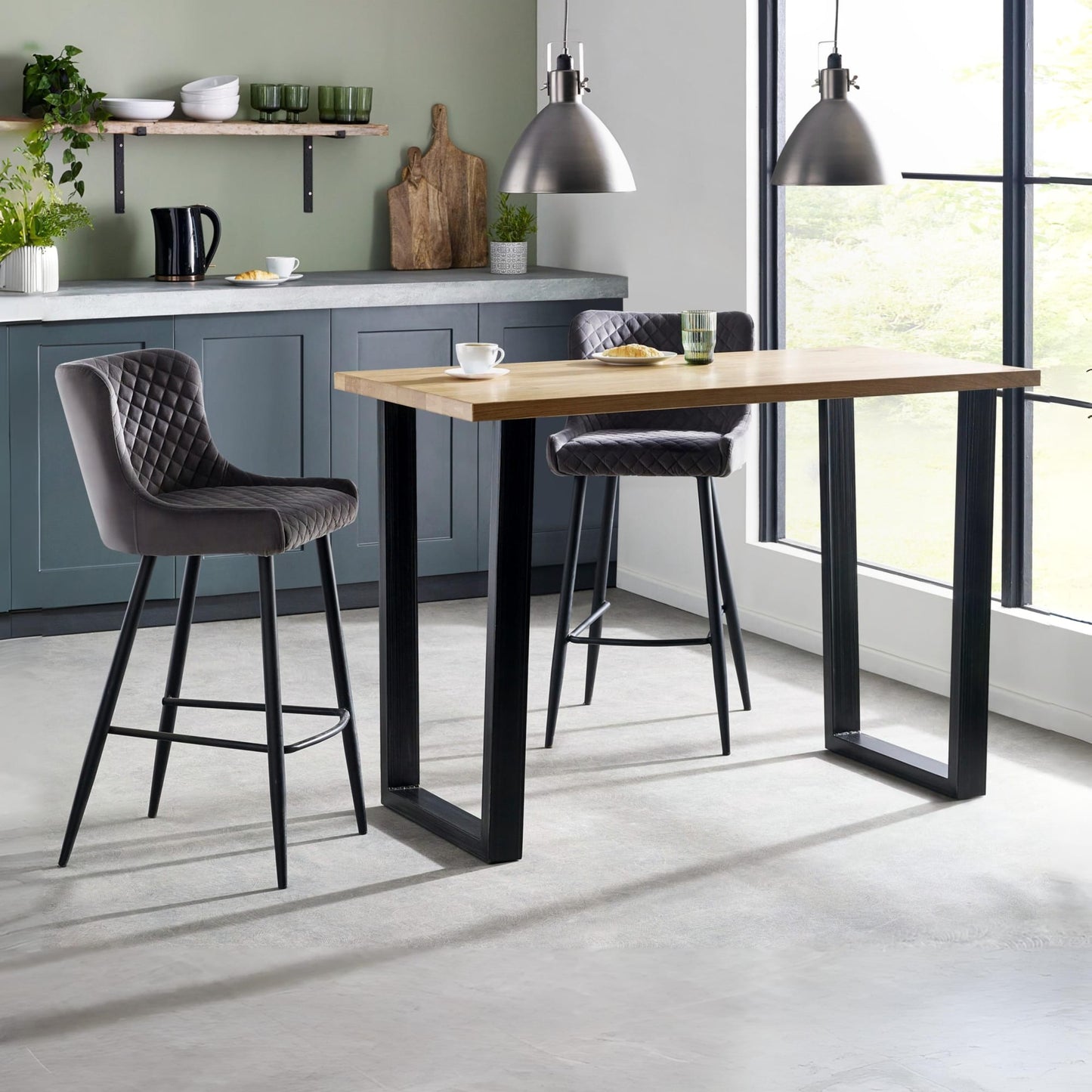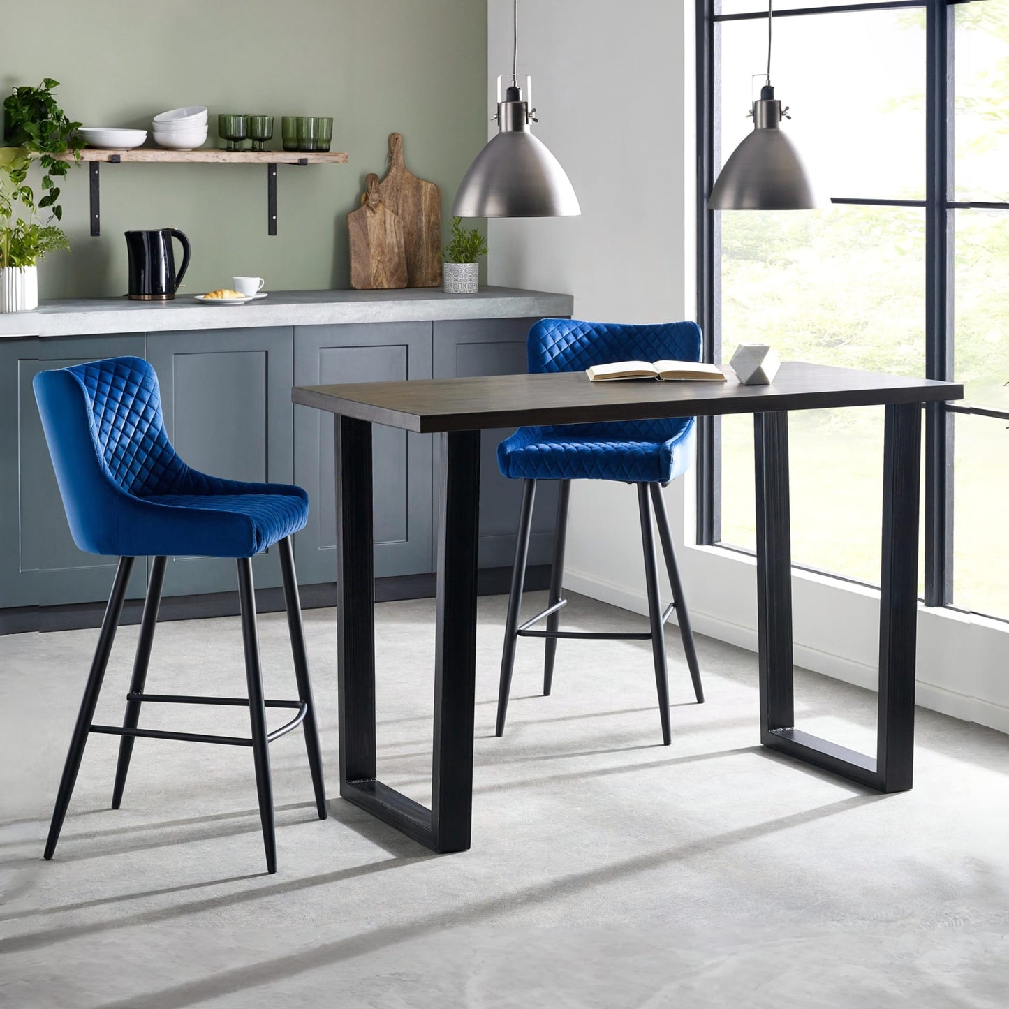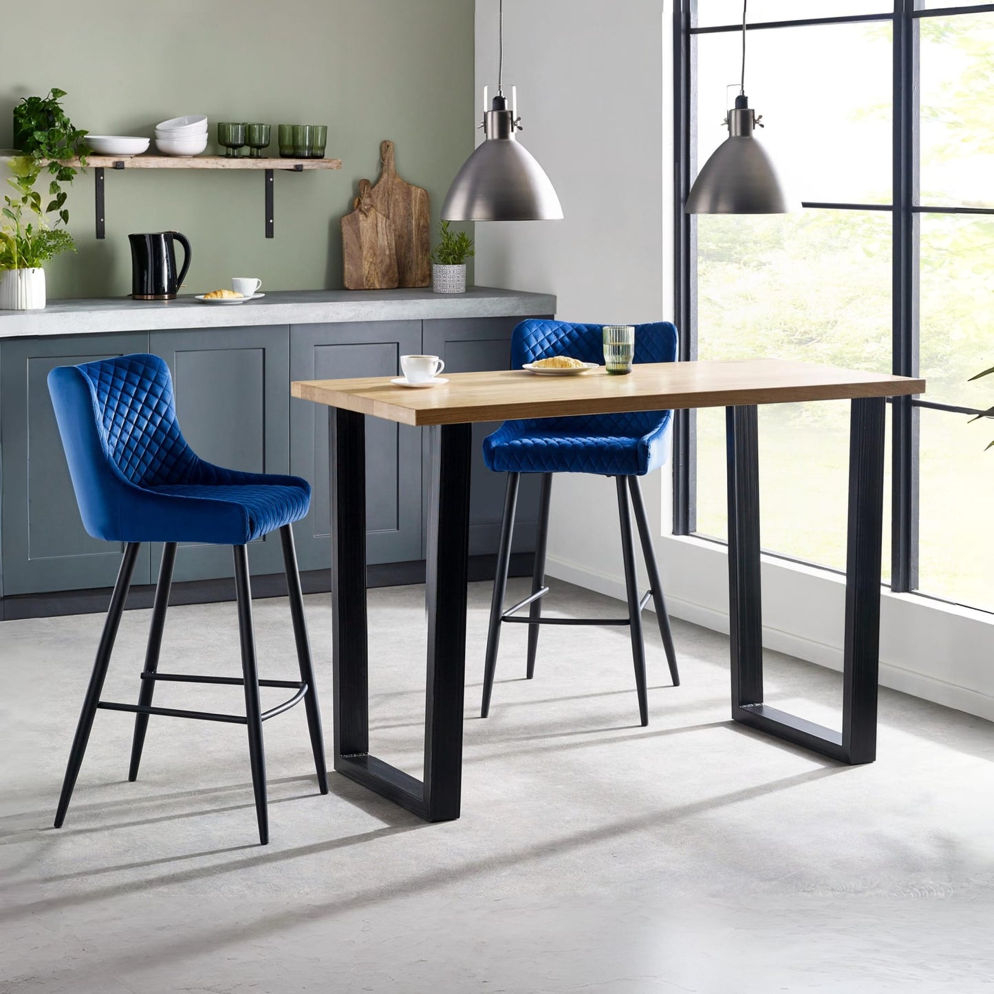 - Pair with a bright coloured velvet bar stool for a modern look, or some industrial leather bar stools for a more retro look.