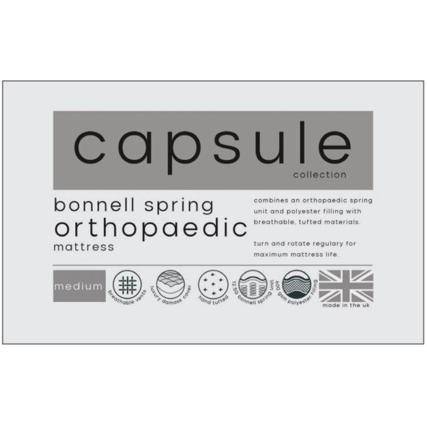 The Capsule Orthopaedic Mattress offers a 12.5 gauge bonnell spring unit, with a 900gsm spring insulator pad and 600gsm polyester pad filling to help you get the best night's sleep. Finished in a soft touch Damask fabric with a feature contrast quilted border and hand tufted with felt washers, this mattress provides the best orthopaedic comfort level you need for a great night's sleep.