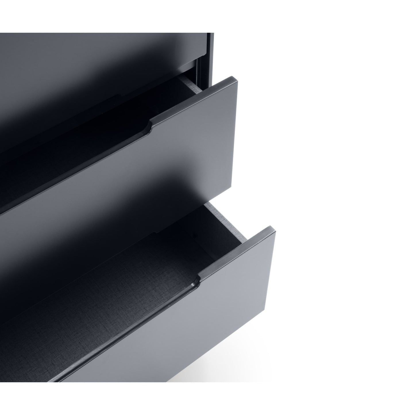 A stylish, retro-inspired chest with five large drawers in an immaculate matt anthracite lacquered finish, with complementary tapered oak finish legs and recessed handles to provide easy opening. The sleek Scandinavian feel fits beautifully with any décor.