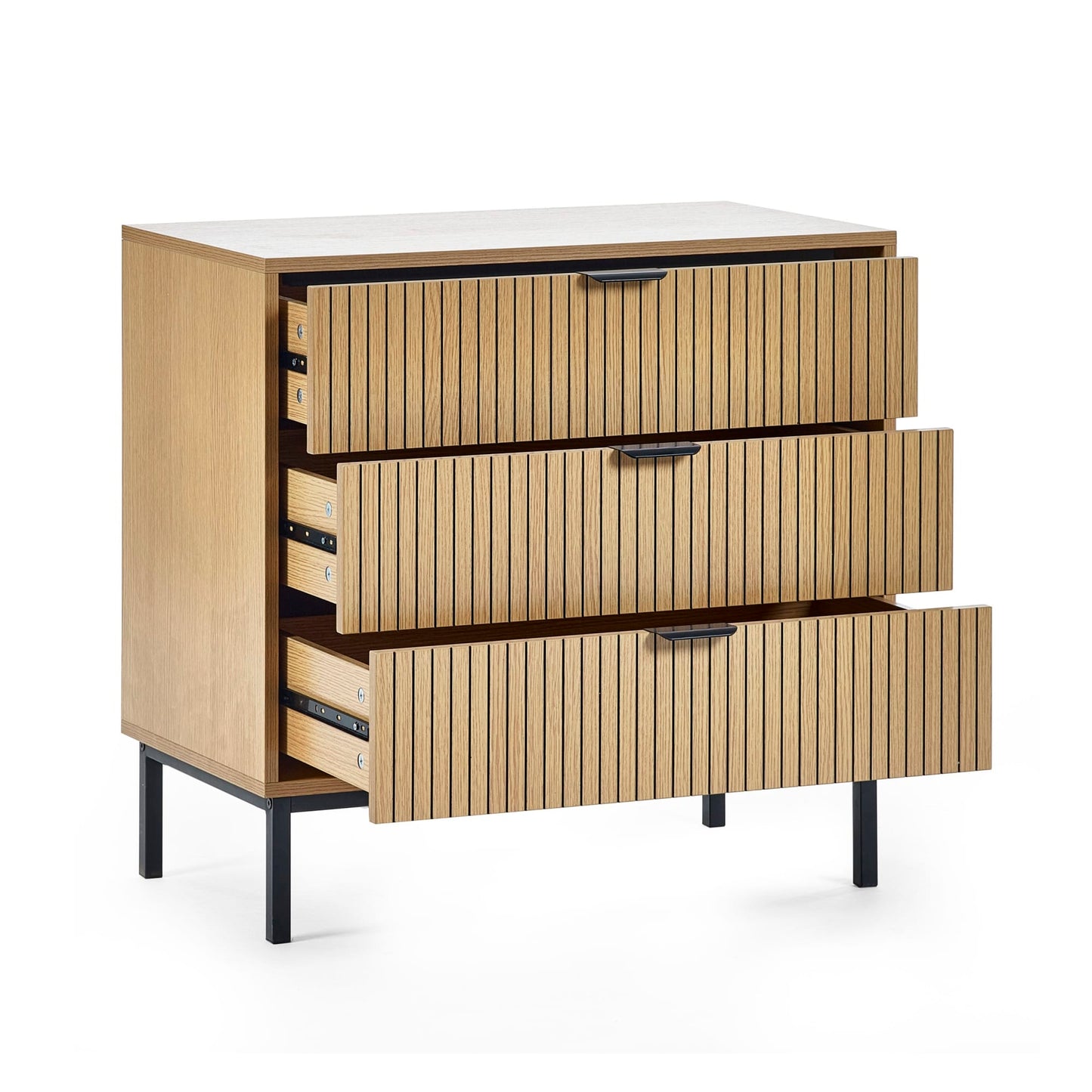 Transform your bedroom into a stylish sanctuary with the Sia 3 Drawer Chest. This beautiful piece showcases a sleek, vertical slat effect that adds a touch of modern elegance, while its warm natural wood finish creates an inviting atmosphere. With three generous drawers, you’ll have all the space you need to organise clothes, linens, and accessories effortlessly. The sleek black metal frame and refined handles enhance its contemporary charm, making it the perfect statement piece to elevate your decor and keep your essentials beautifully organised. Minimal assembly required for quick setup.