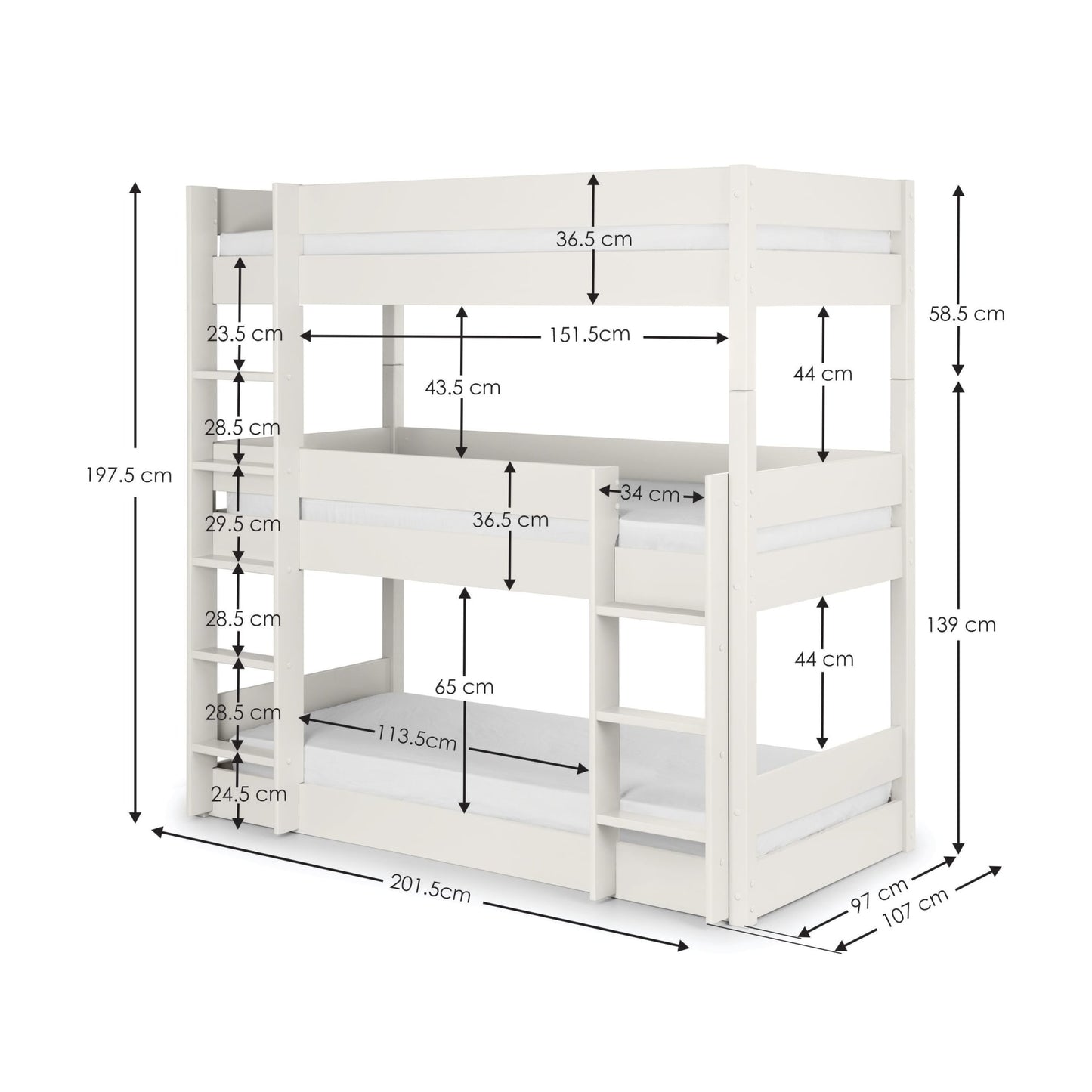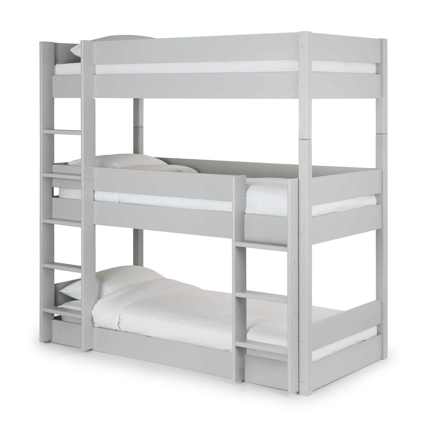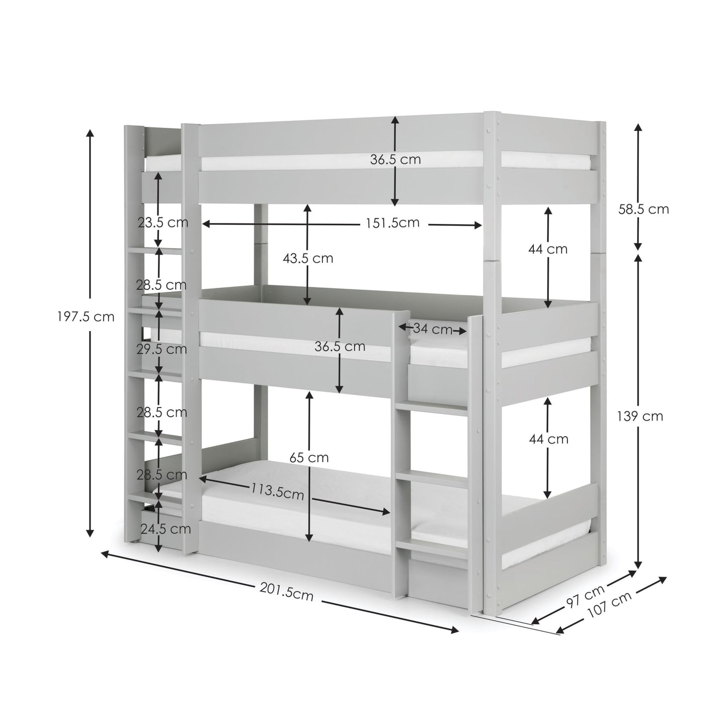 Accommodating 3 children whilst only using the space of one single bed, the Trio bunk bed is the perfect solution for those short on space in smaller bedrooms. Ideal for sleeping siblings, or regular sleepovers the durable Trio Bunk is finished in a stylish grey, matching any bedroom decor. Crafted from solid pine and MDF, this safe and sturdy design is essential for maximising space.