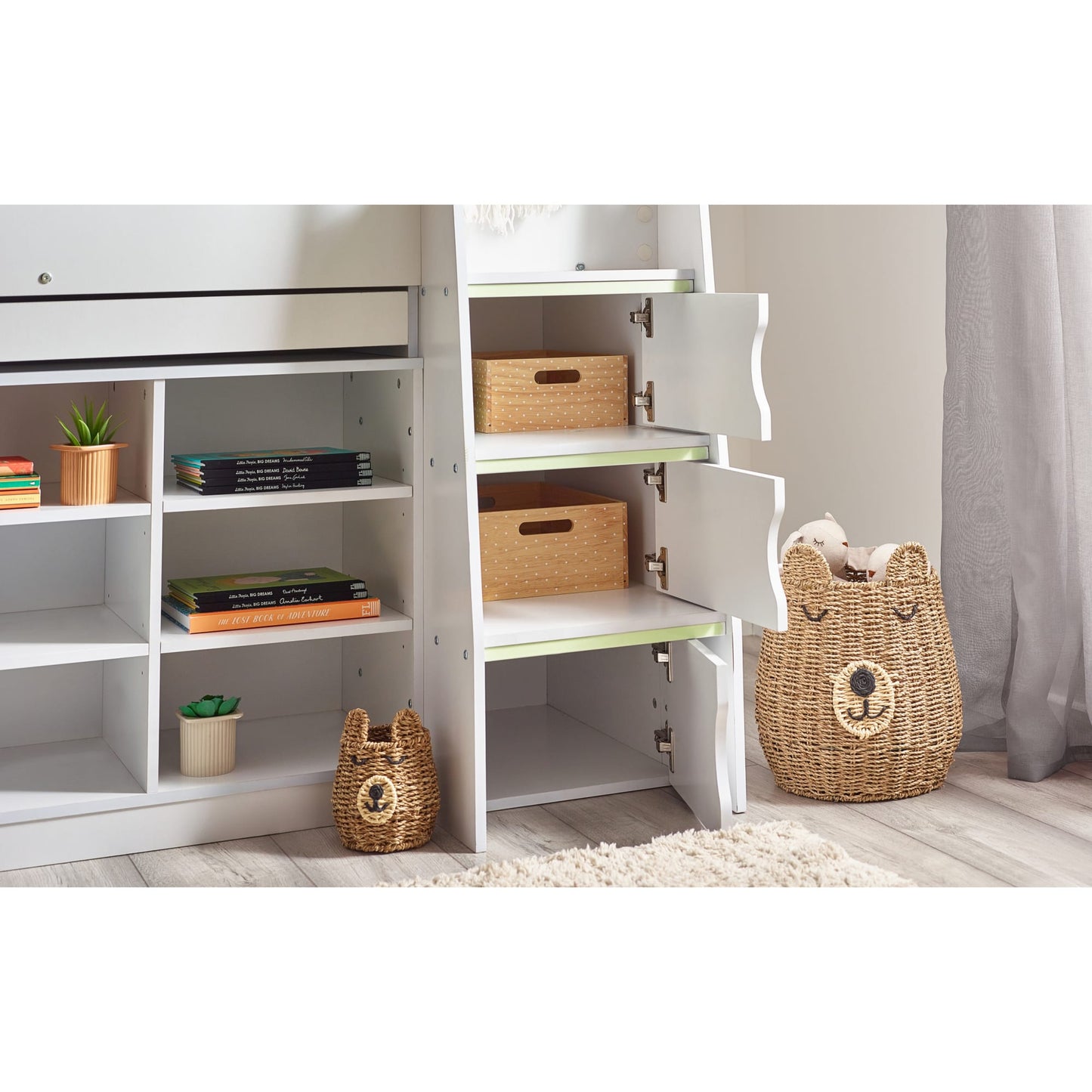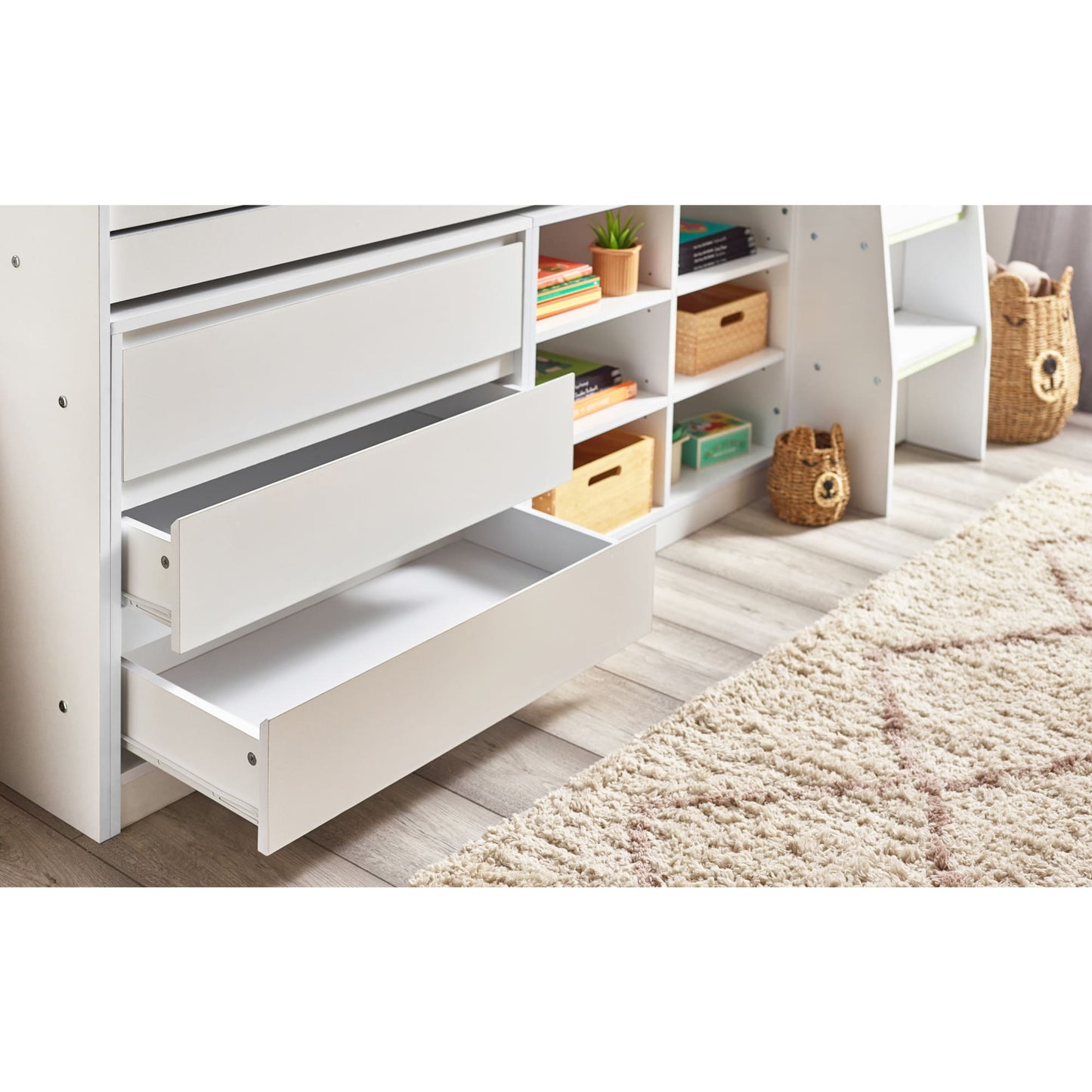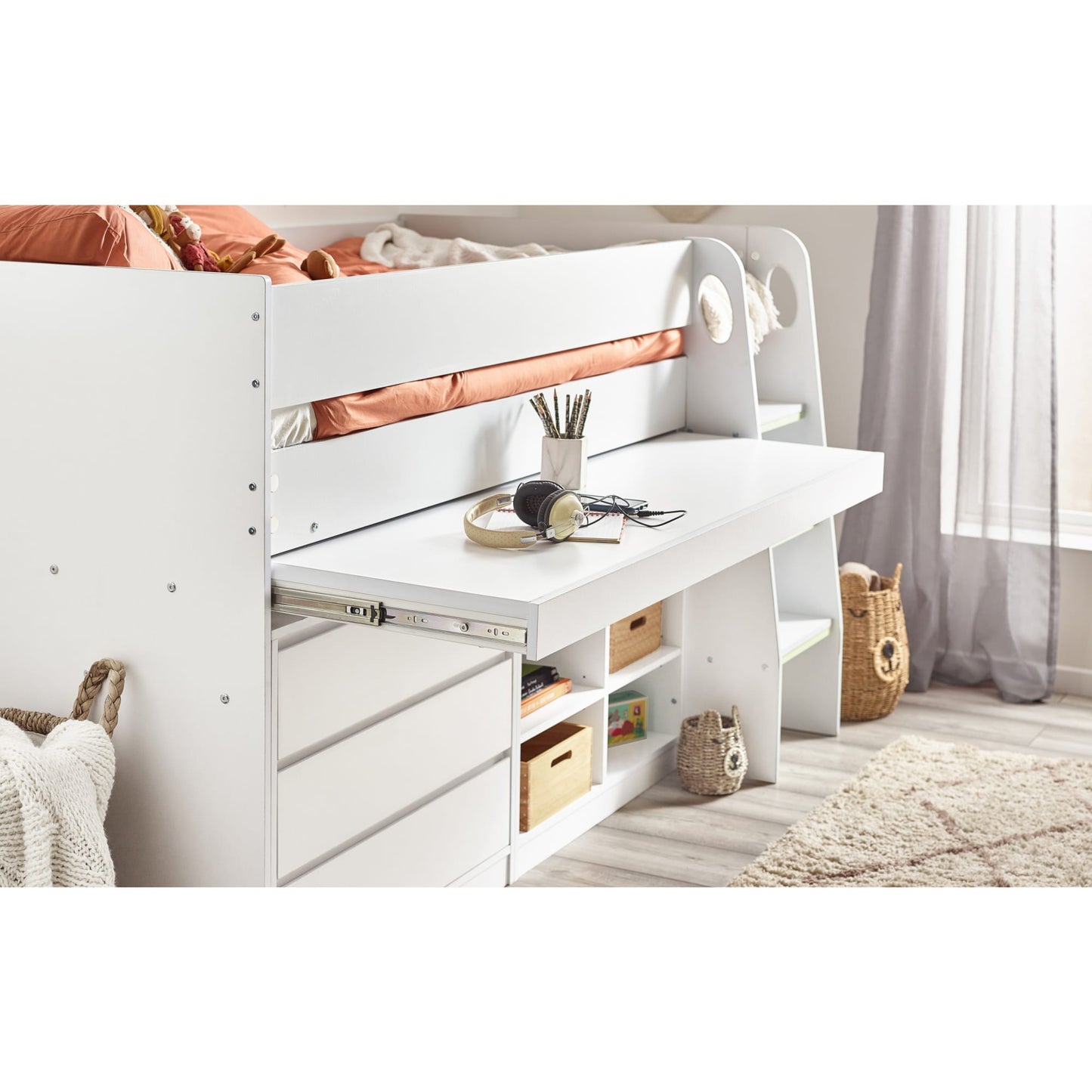 - Space-Saving Design: Combines a bed with storage and play space underneath. Sturdy Construction: Made from high-quality materials for durability. Safe and Secure: Features safety rails to prevent falls. Stylish Look: Sleek white finish that complements any bedroom decor. Easy Access: Ladder included for easy access to the bed.