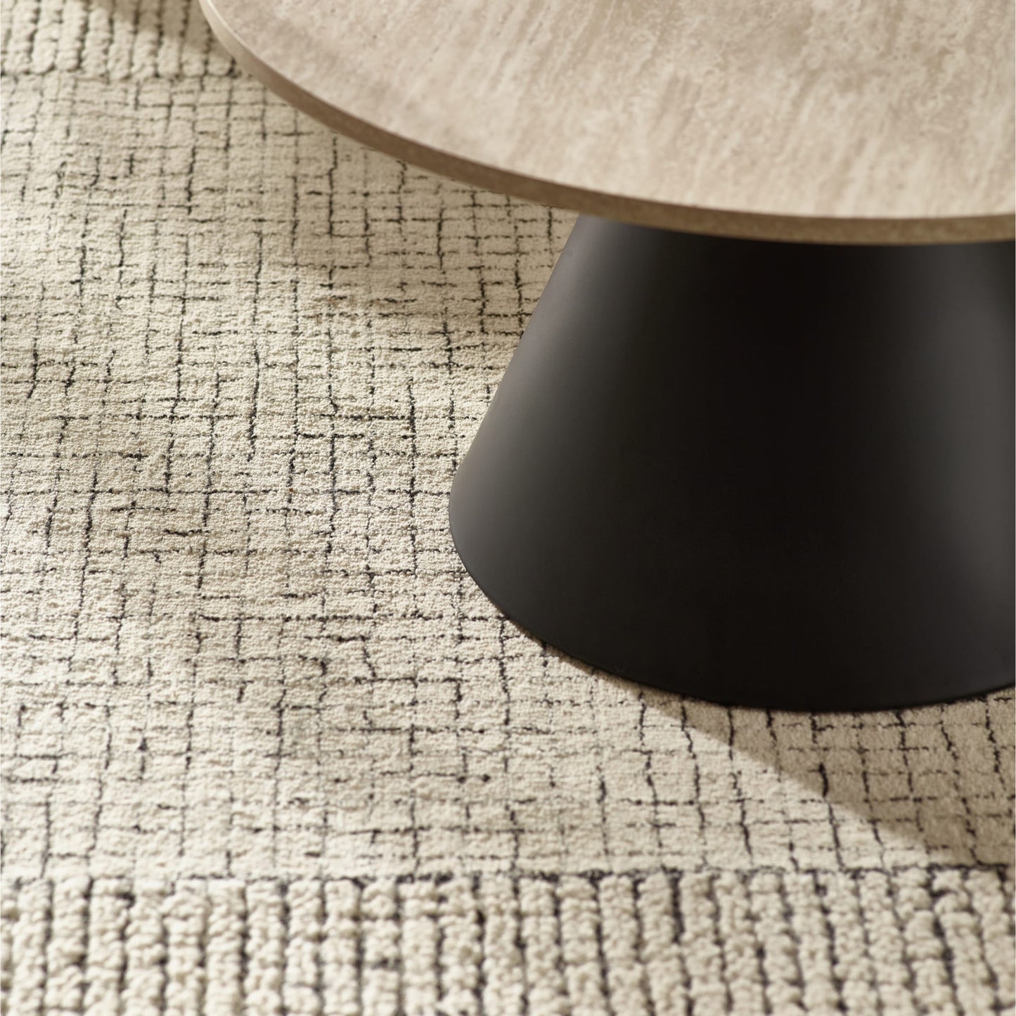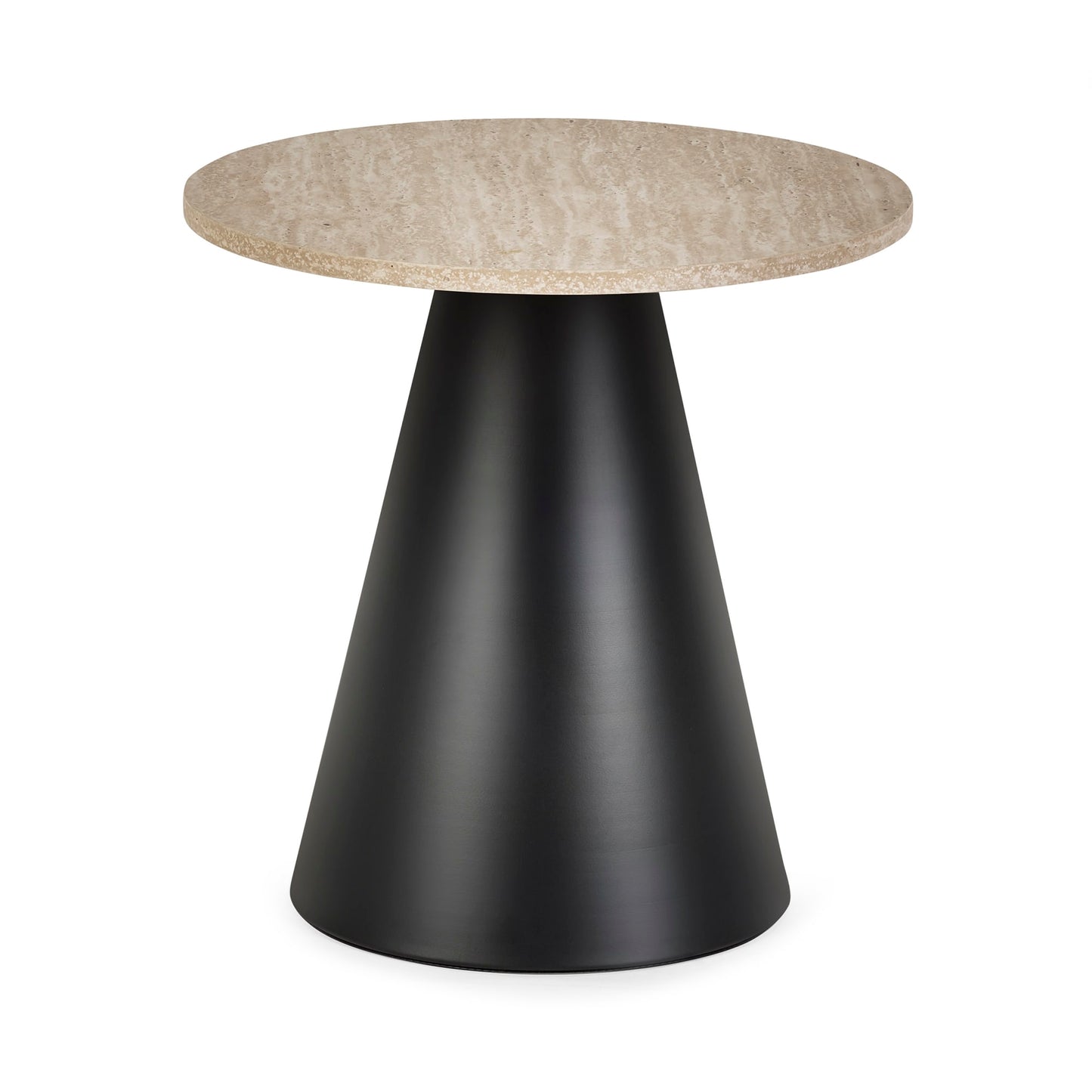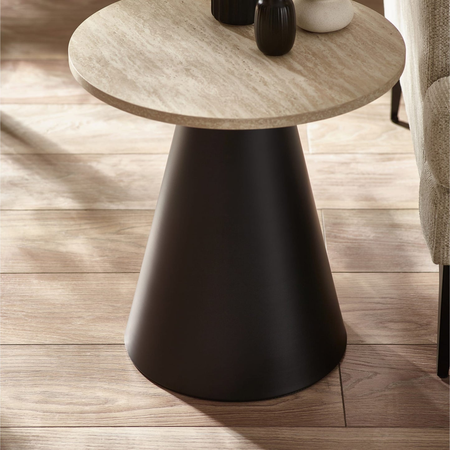 Introduce sculptural elegance to your living room with this modern coffee and lamp table set. Featuring travertine-effect tops and bold conical pedestal bases, each piece blends tactile texture with clean architectural form. The powder-coated black metal bases create striking contrast and ensure long-lasting durability, while the soft stone-look surface brings a refined, natural feel. Perfect for styling with décor accents like vases, books, or plants, the two sizes offer flexible placement and layered visual interest in lounges and open-plan spaces. Assembly required.