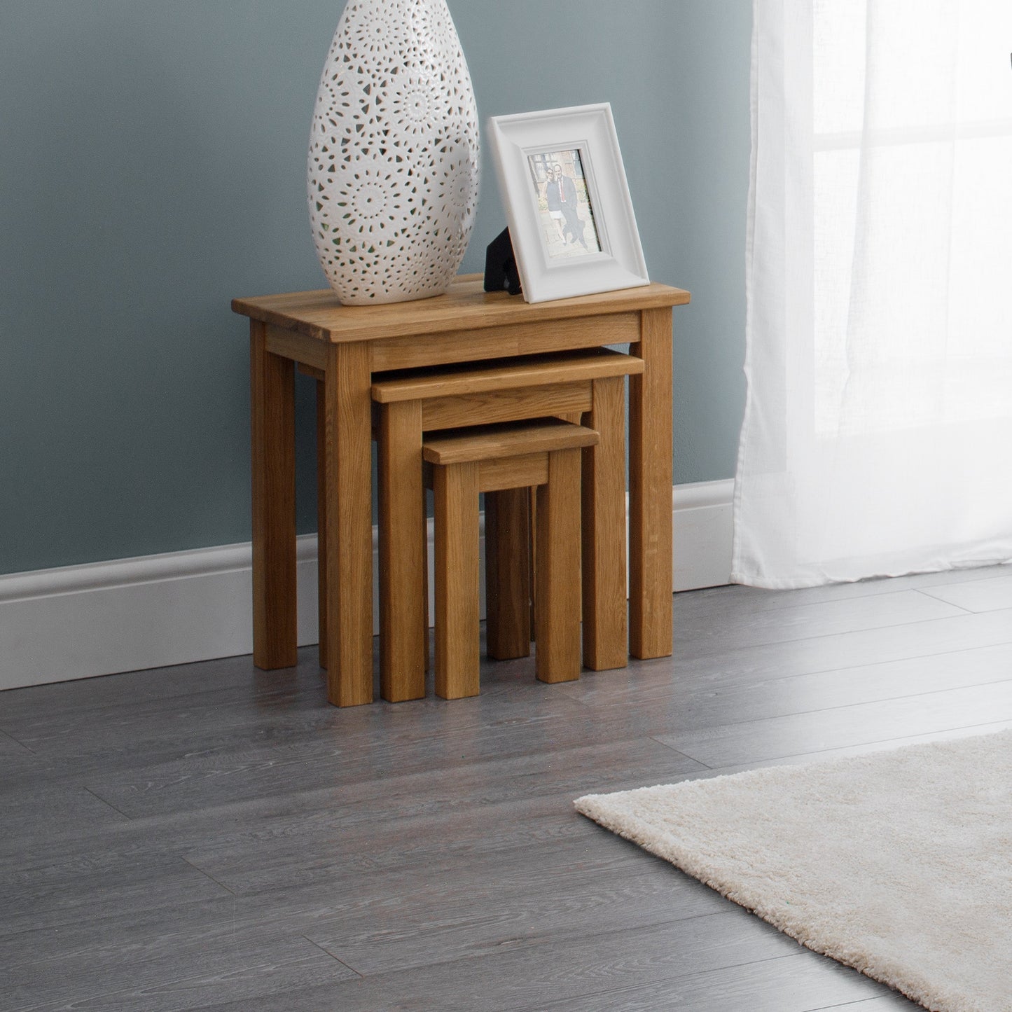 - Timeless Design: The Coxmoor Nest of Tables features a classic oak finish and clean lines, perfect for traditional and contemporary living spaces. Space-Saving Solution: Includes three tables that nest together, providing a versatile and compact solution for any room. Sturdy Construction: Made from solid oak for durability and stability. Easy to Clean: The smooth surface is easy to maintain and keep looking new. Versatile Use: Suitable for living rooms, bedrooms, and hallways.