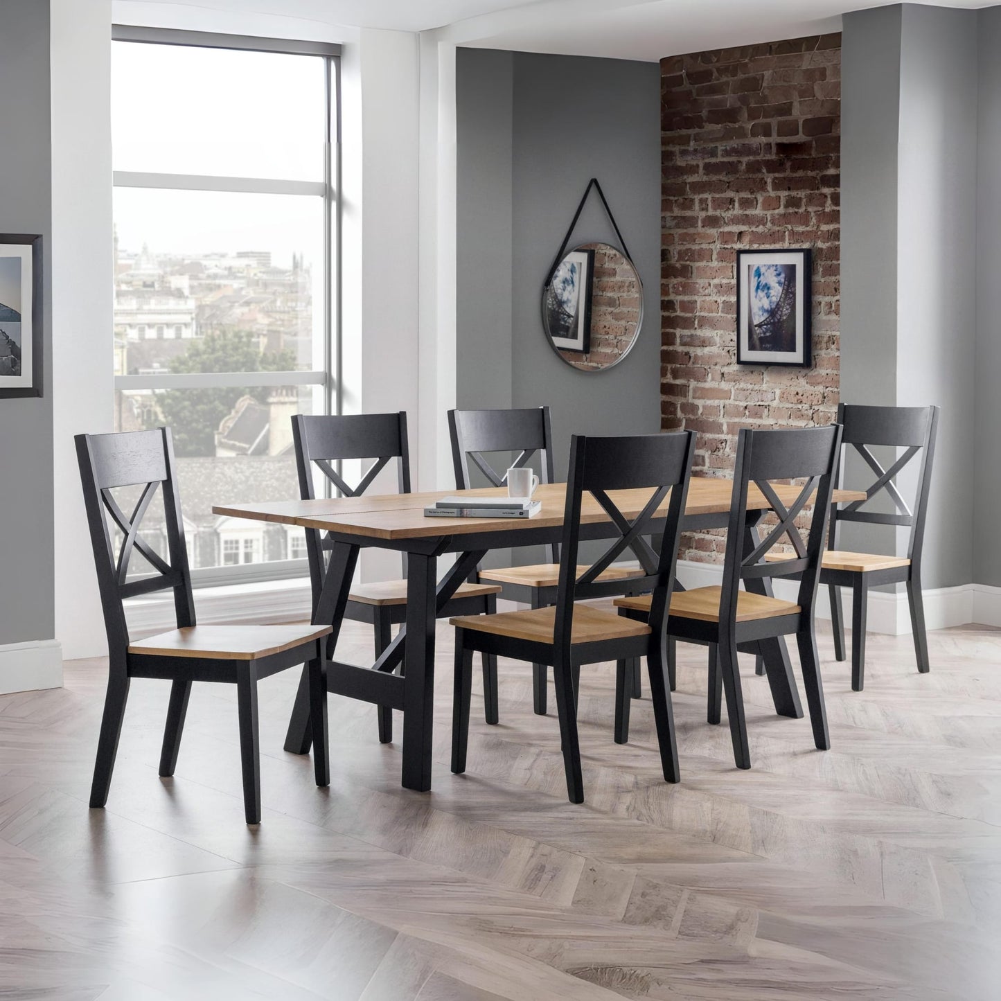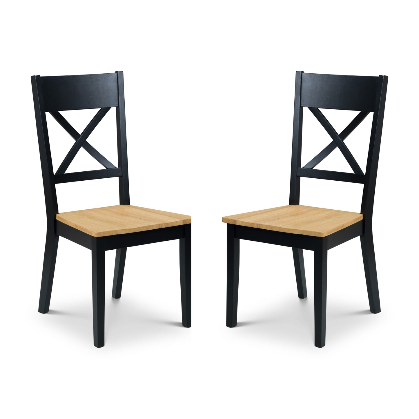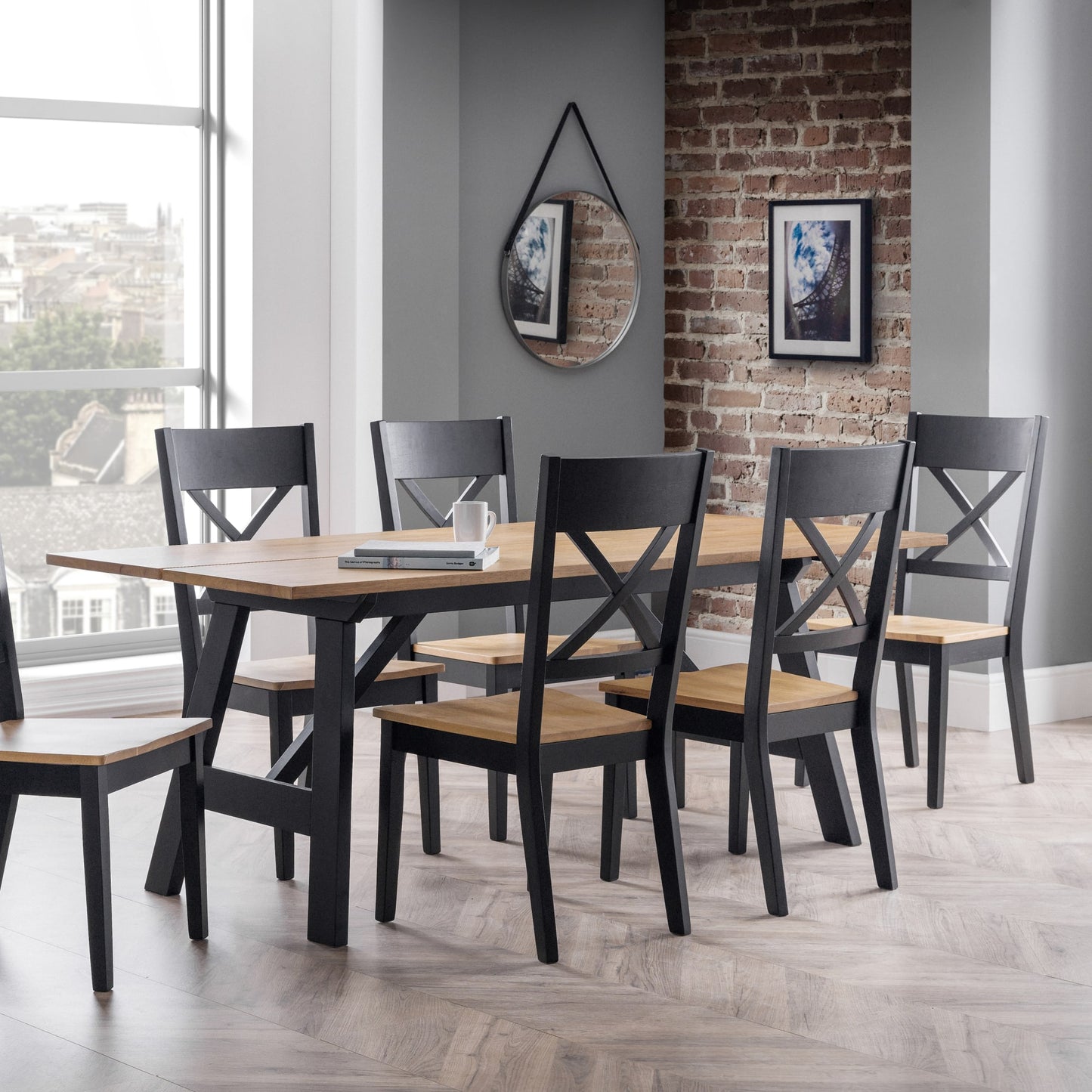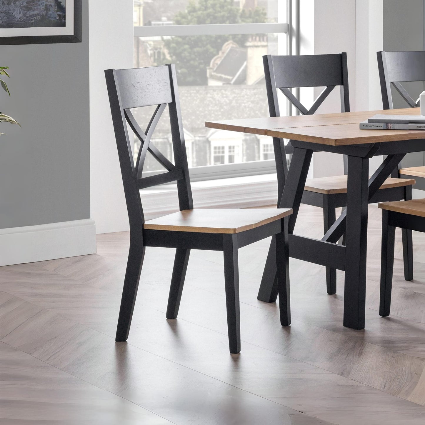 This elegant chair is finished with a cross back, black painted frame perfect for a wide range of home décor. Featuring a 20mm thick rubberwood seat pad, the Hockley dining chair ensures long lasting durability. The perfect match for the Hockley Dining Table.