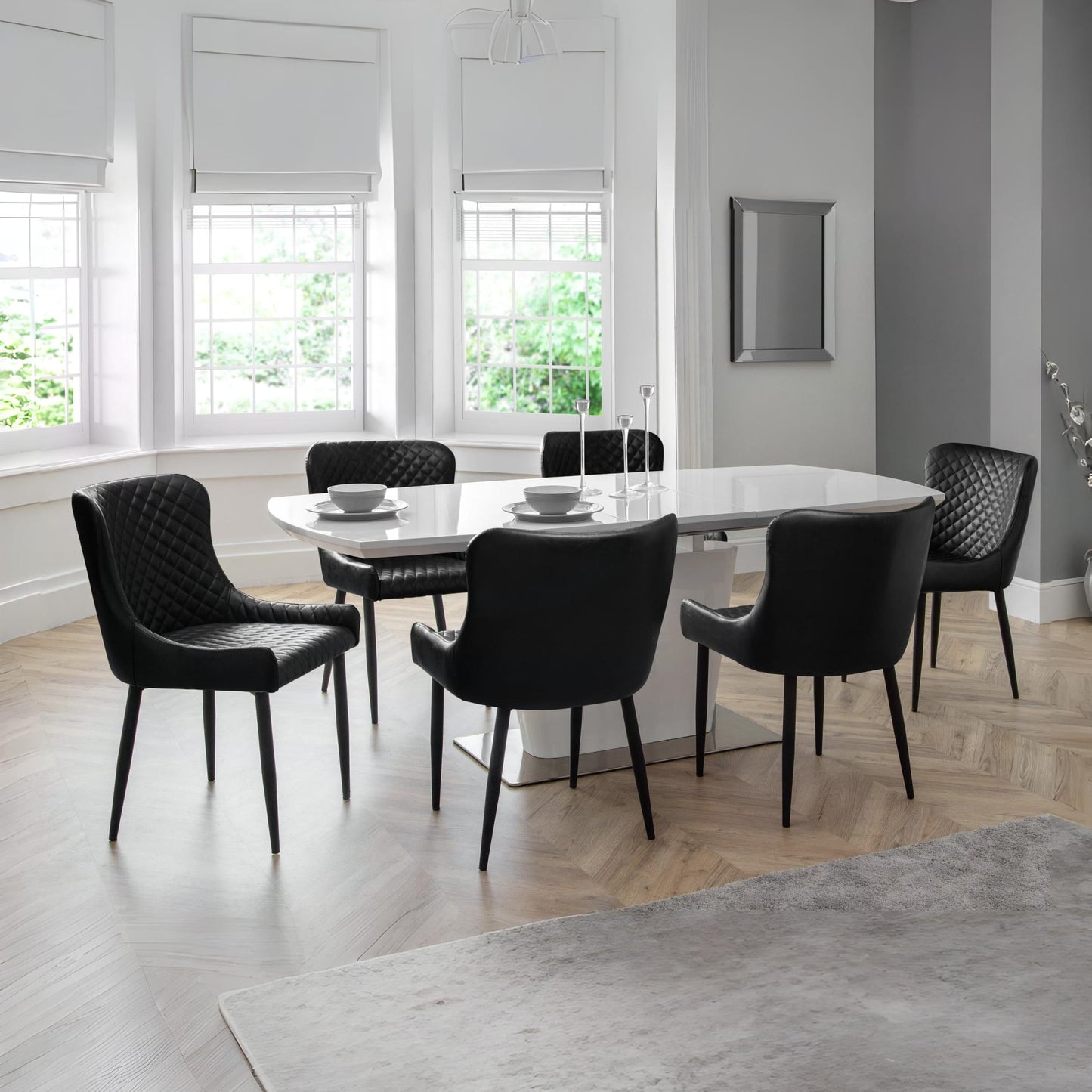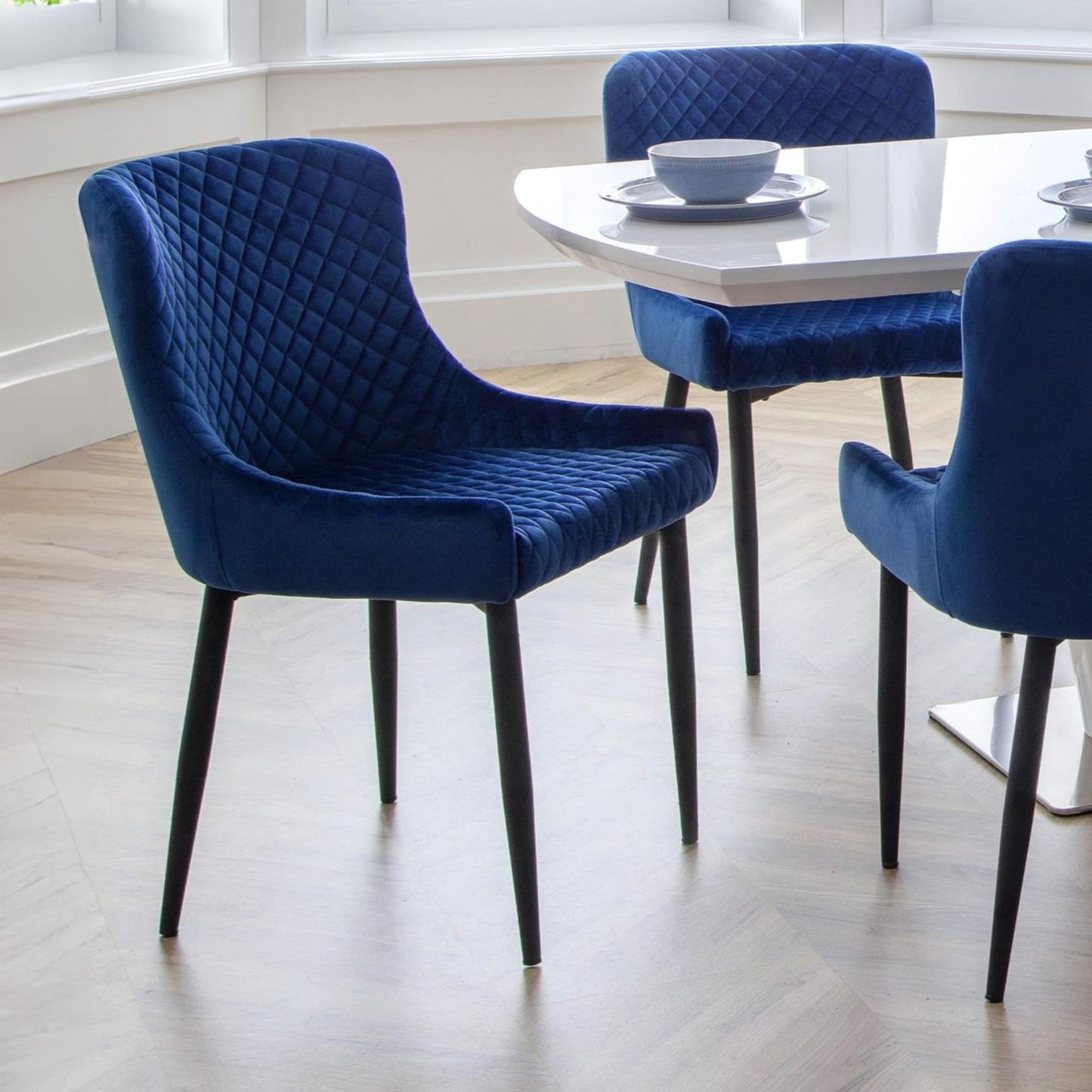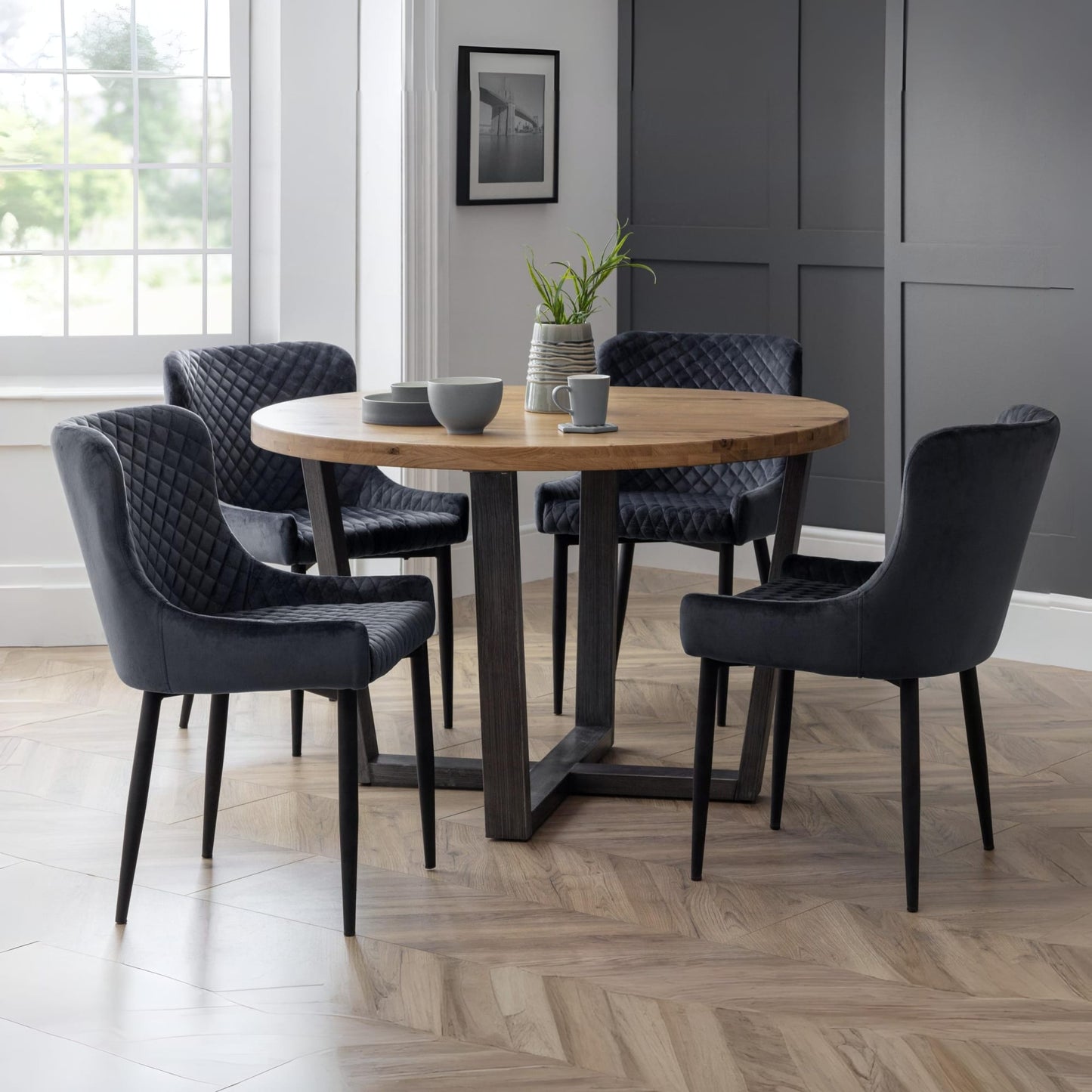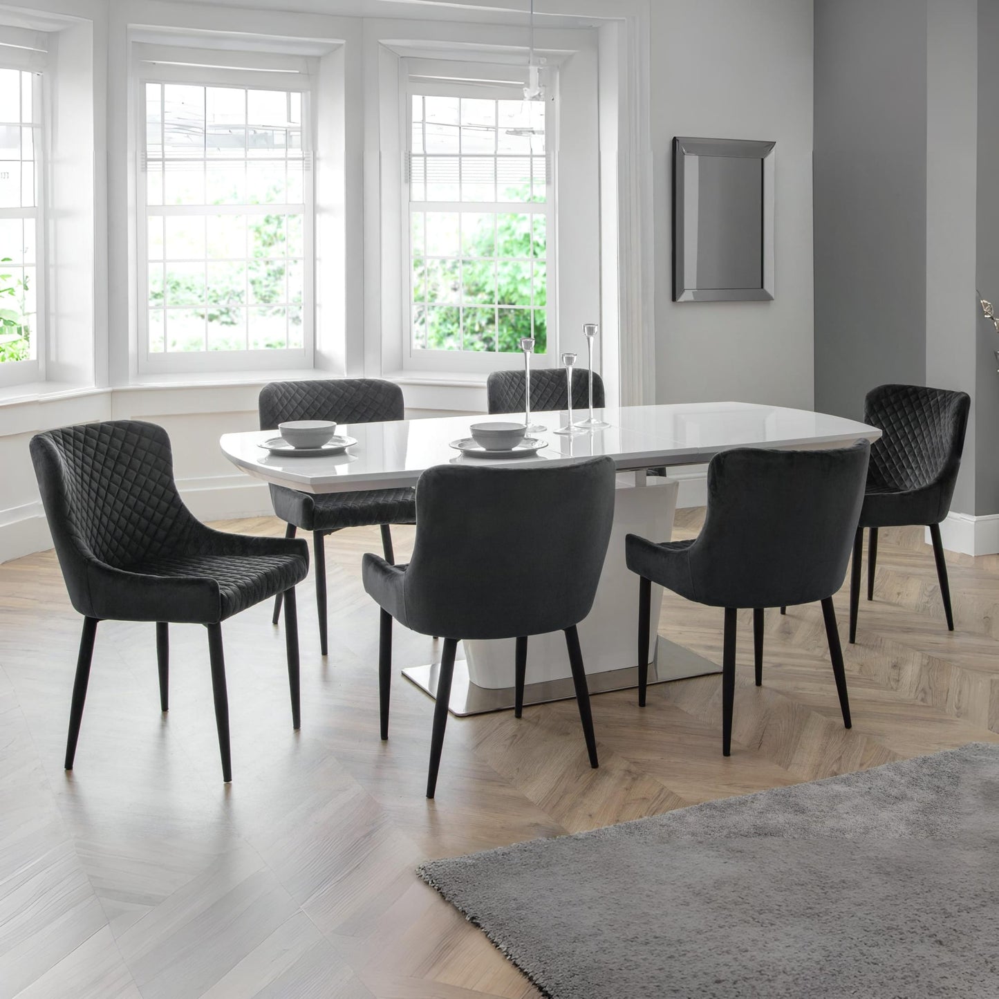 Combining a classic style with a modern twist, the Luxe dining chair is beautifully upholstered in a grey velvet fabric with luxurious quilted detailing. Featuring contemporary black painted legs, this dining chair adds a touch of elegance to any dining area.