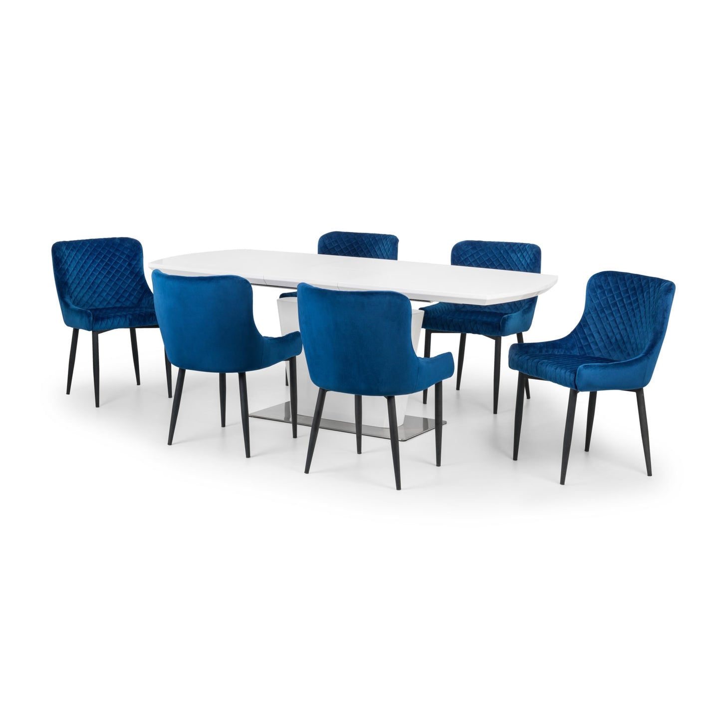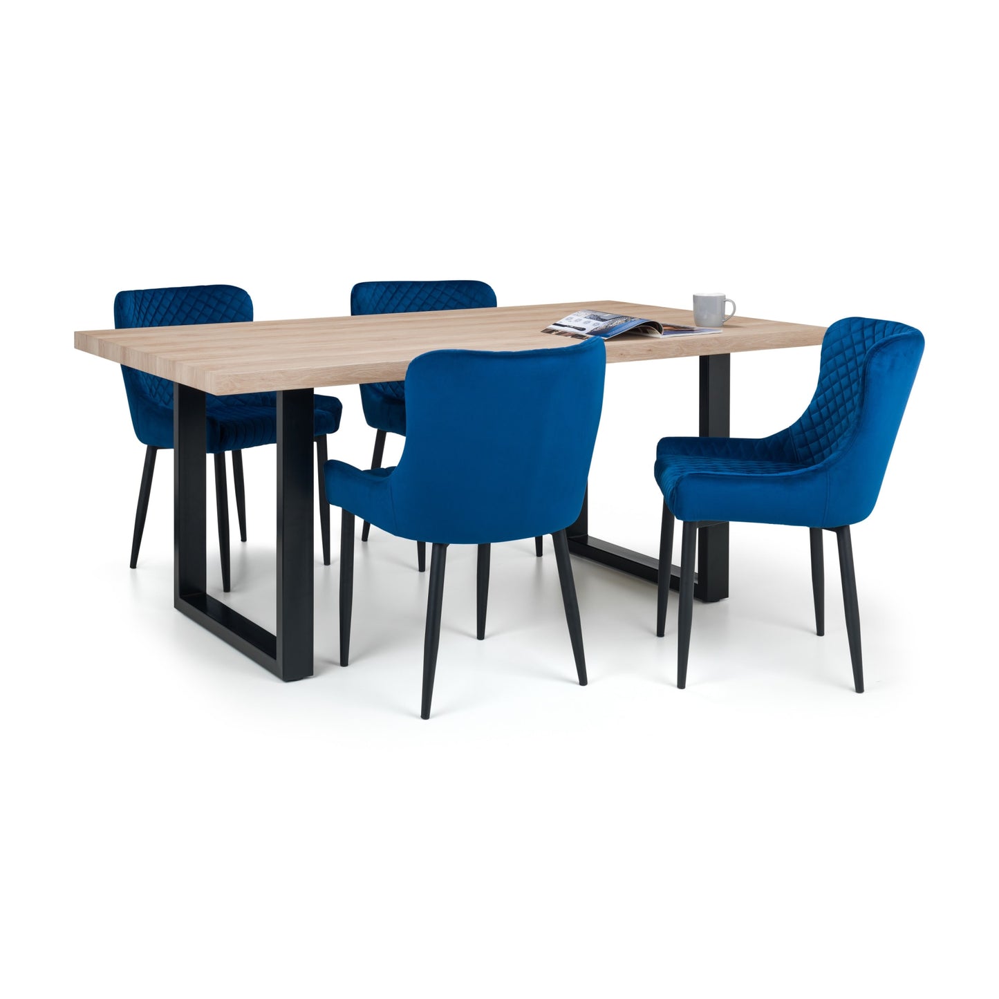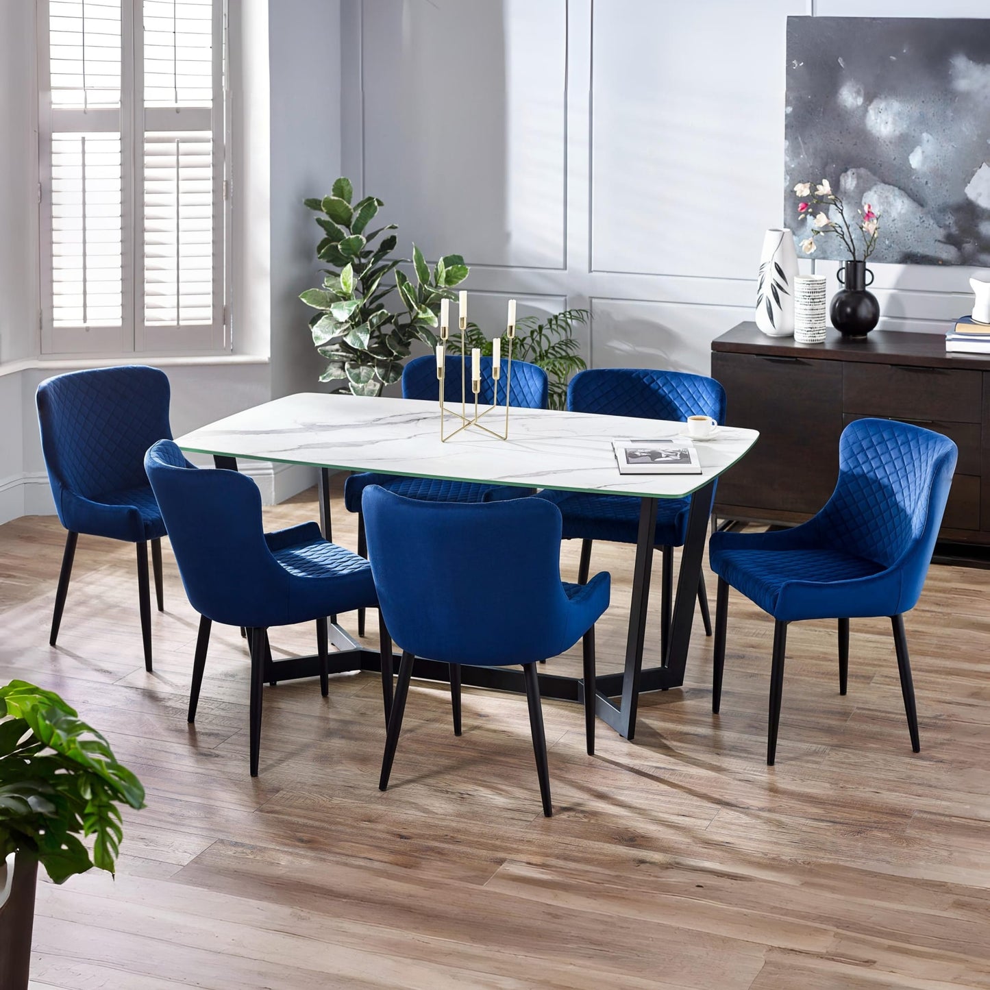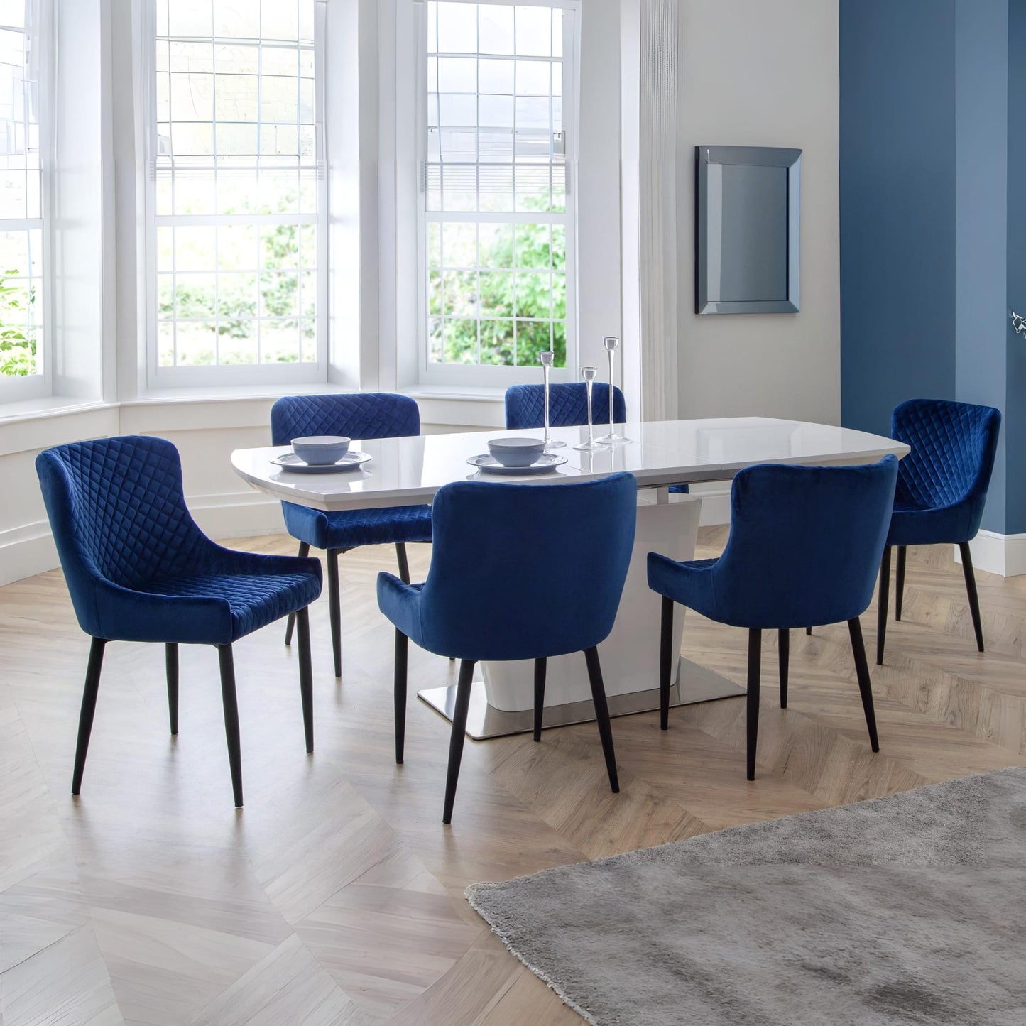 - Upholstered in luxurious blue velvet fabric with quilted detailing.