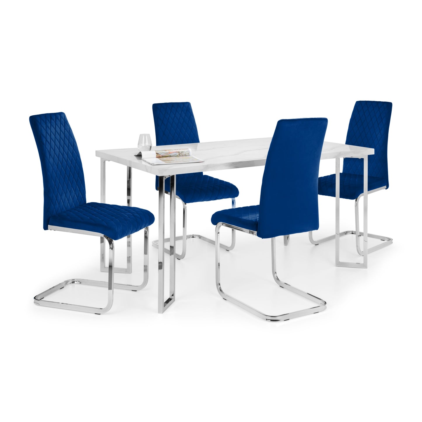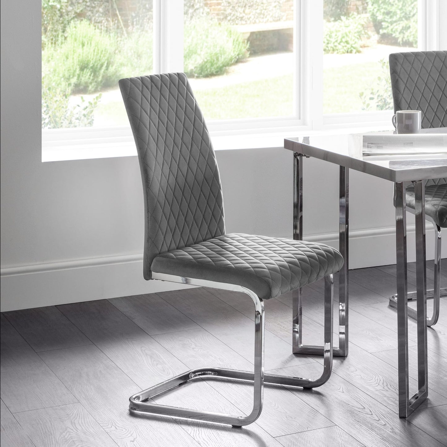 The modern Calabria Dining Chairs offering an elegant touch to any dining area. Upholstered in a choice of grey or blue rich velvet, with delicate diamond stitching upon a high, curved back rest for added comfort. Finished with a chrome plated cantilever frame, this dining chair is perfect for a wide range of Julian Bowen dining tables.
