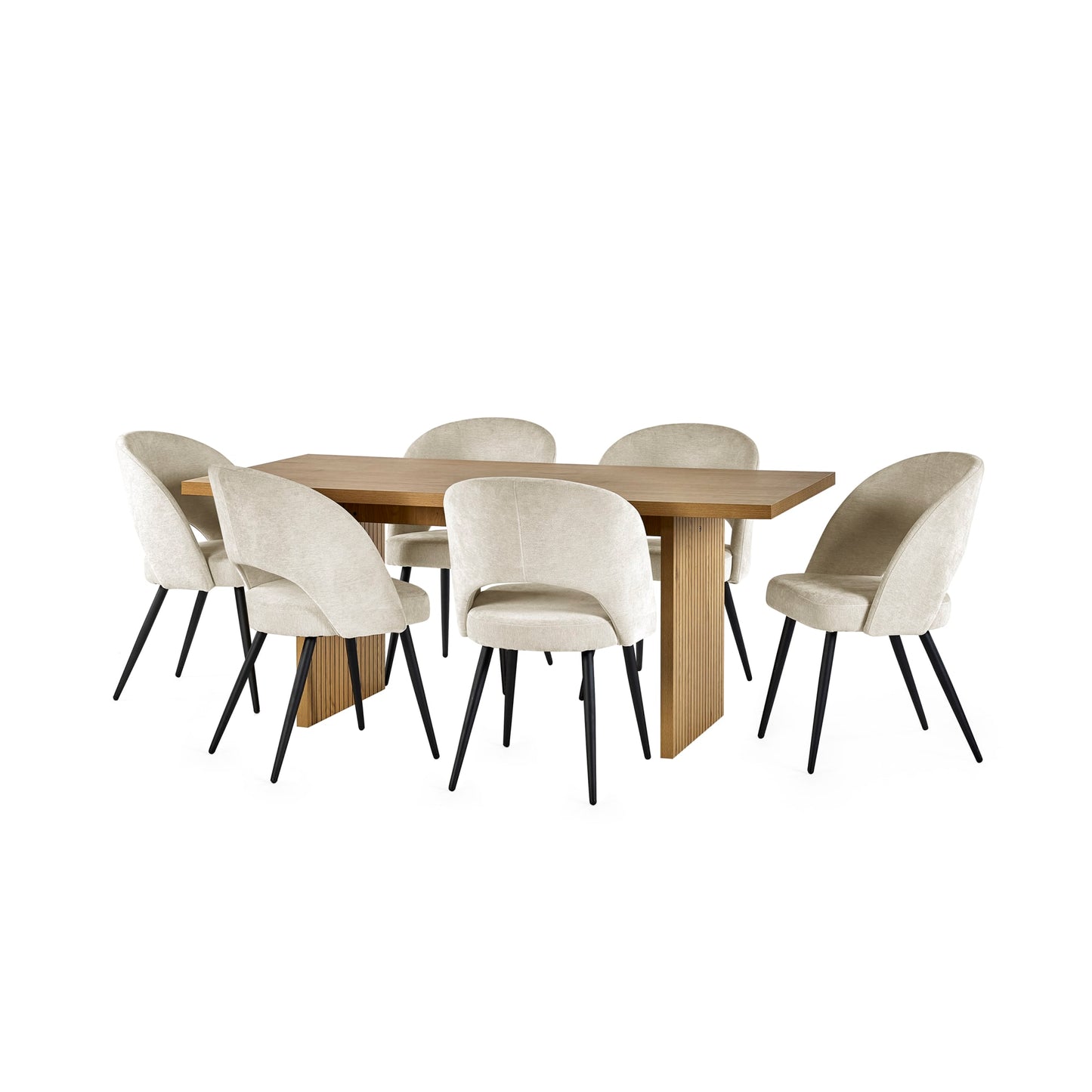 Dine in style with this bold rectangular table that brings a fresh, modern feel to your space. The light oak effect finish adds warmth, while the wide slatted legs are accented with slim black lines for a touch of contrast and character. Generously sized to seat six comfortably, it's ideal for everything from quick breakfasts to relaxed get togethers. Assembly required. Chairs sold separately.