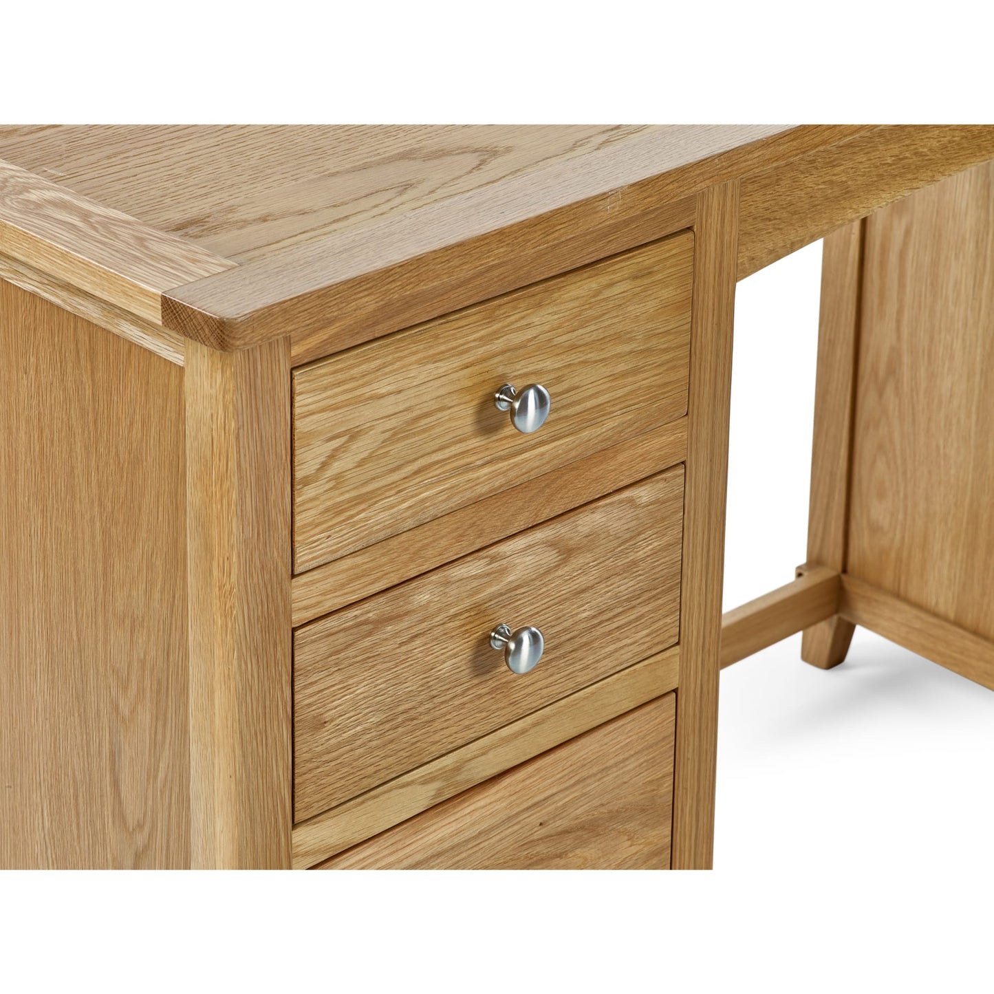 Crafted from solid oak and oak veneers this dressing table and stool set is the perfect addition to any bedroom space. Combining durability and style, with 6 generously sizes drawers providing copious amounts of storage space. Finished with round silver knobs and partnered with a comfortable and robust grey pad stool