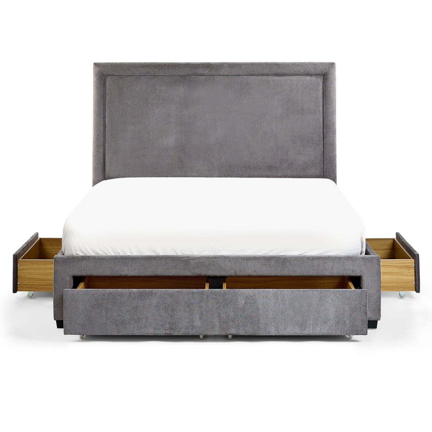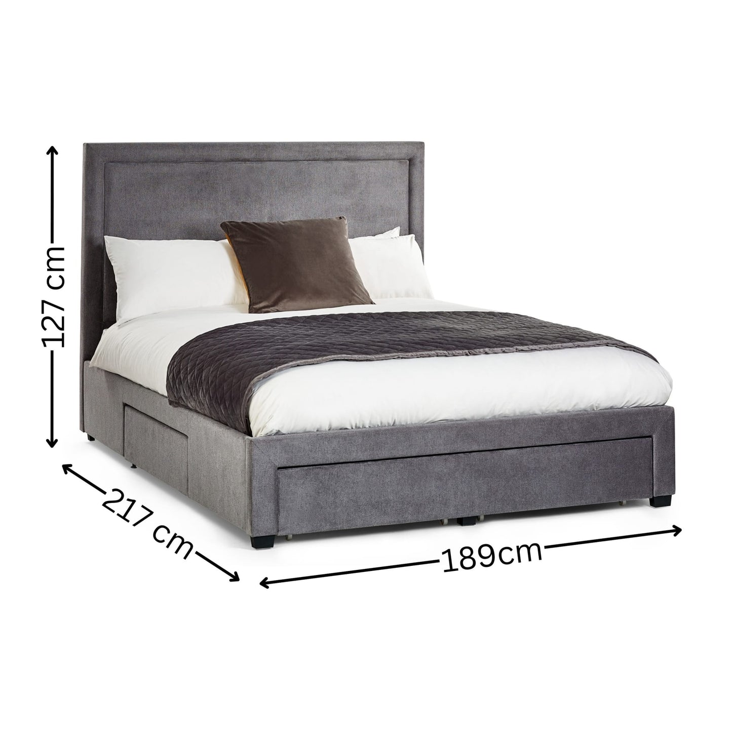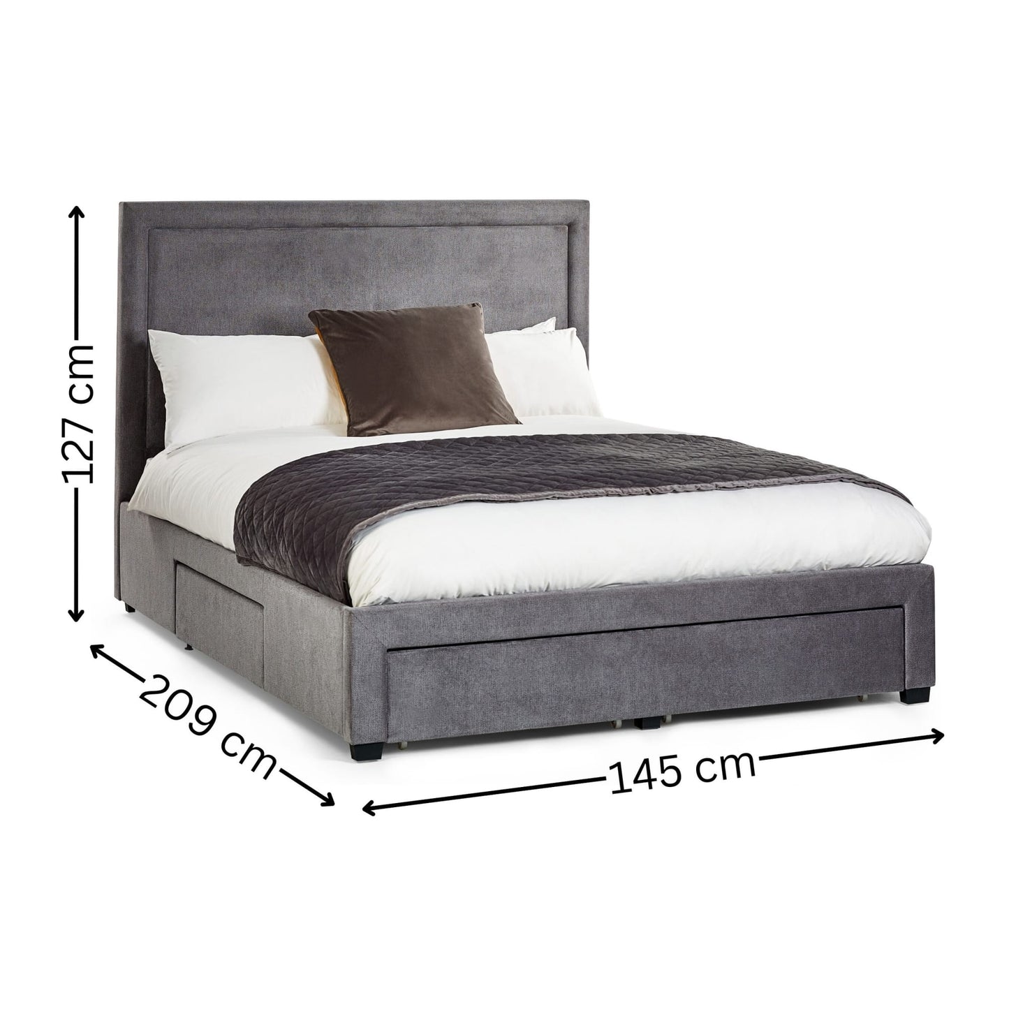 Indulge in luxurious style and functionality with this 135cm grey 4 drawer bed. Beautifully crafted with a sleek grey upholstered frame, it features a refined headboard outline that adds a sophisticated touch to your bedroom. The plush, padded headboard ensures ultimate comfort, while the four spacious under-bed drawers offer discreet storage to keep your space organised. Blending modern elegance with practical convenience, it effortlessly enhances your room. With minimal assembly required, you can effortlessly transform your space into a lavish retreat. Mattress sold separately.