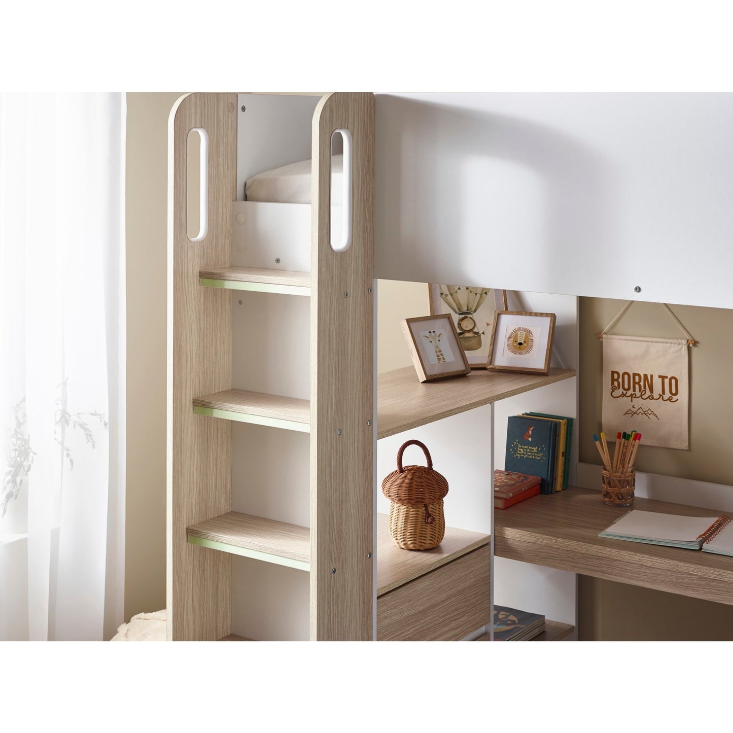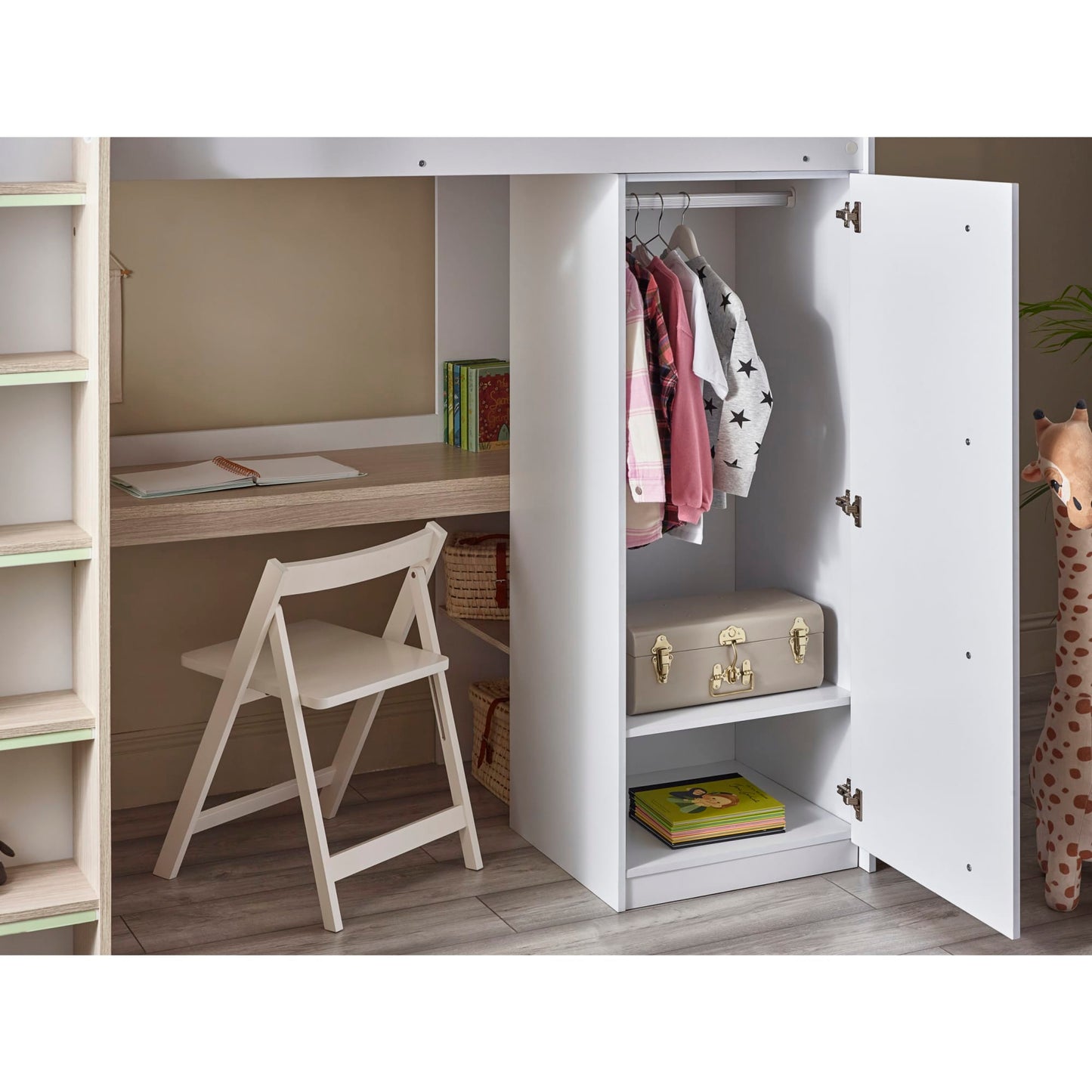 Stylish yet practical, the Ocean Highsleeper is the perfect bed for younger ones, finished in matt white with woodgrain accents. This high sleeper features an angled corner desk, combined with a storage drawer and built-in shelving units, plus a hidden enclosed one-door wardrobe. Providing both space and comfort to meet every kid's needs.