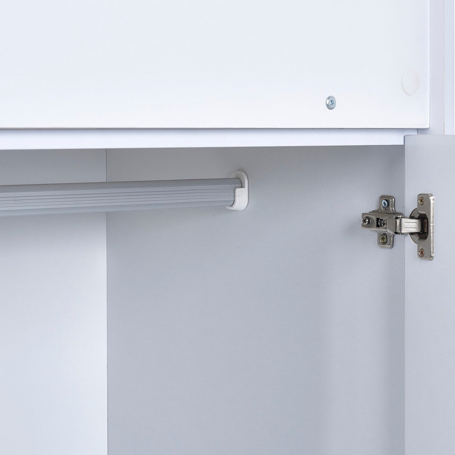 - Features a corner desk, one-door wardrobe, and built-in shelving units