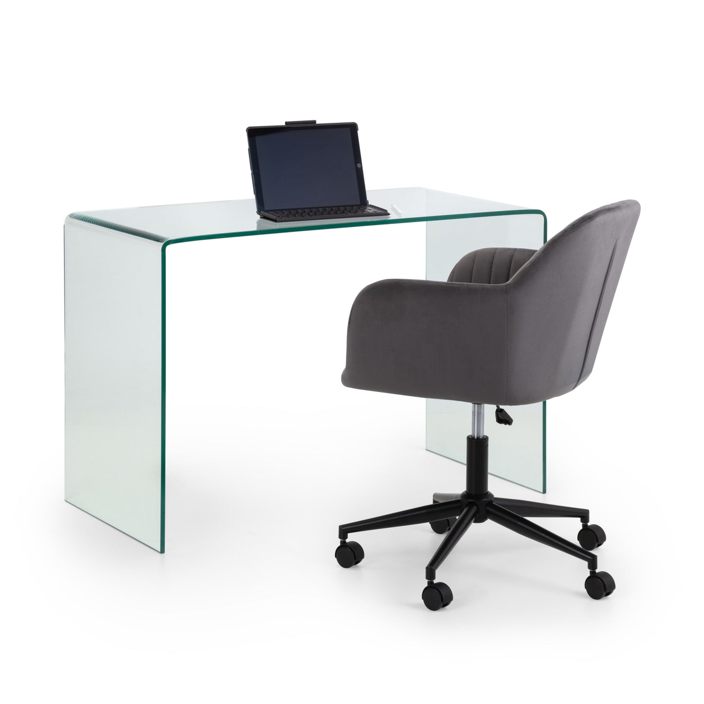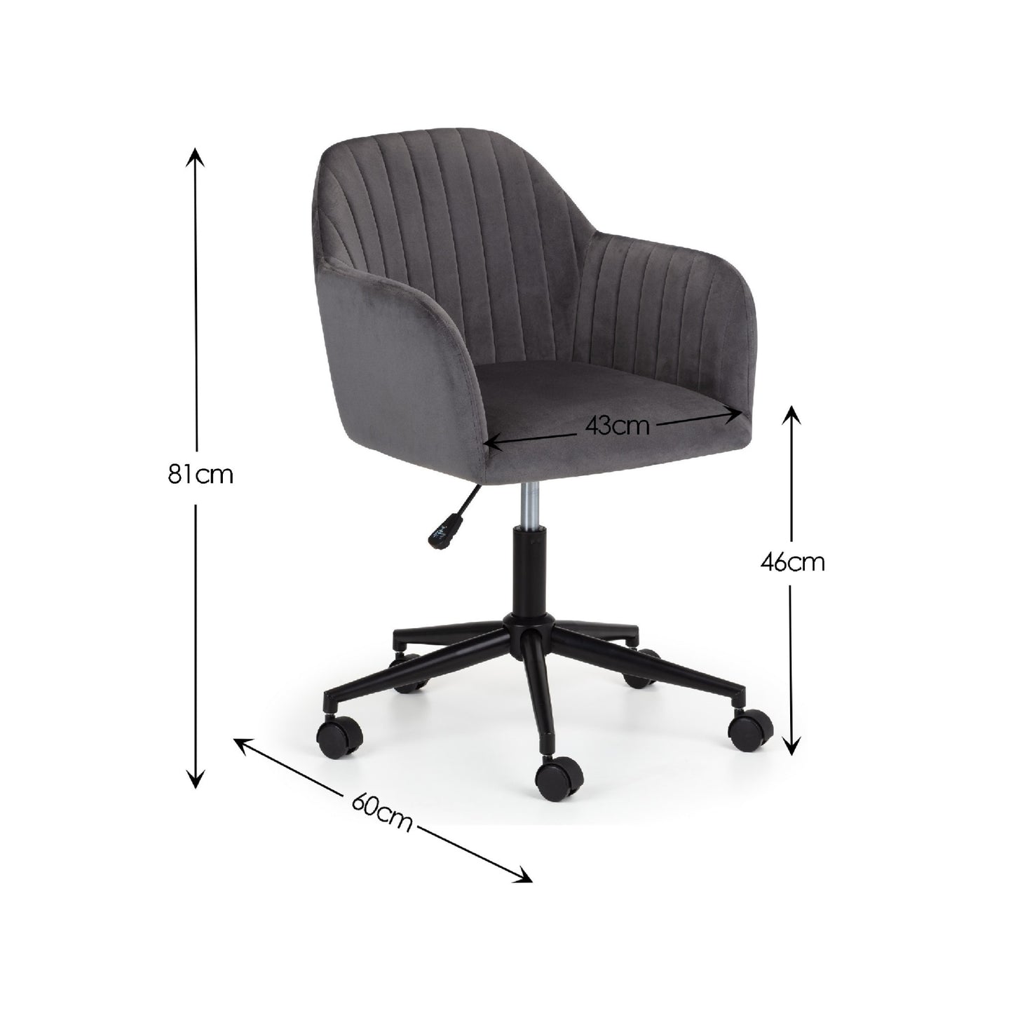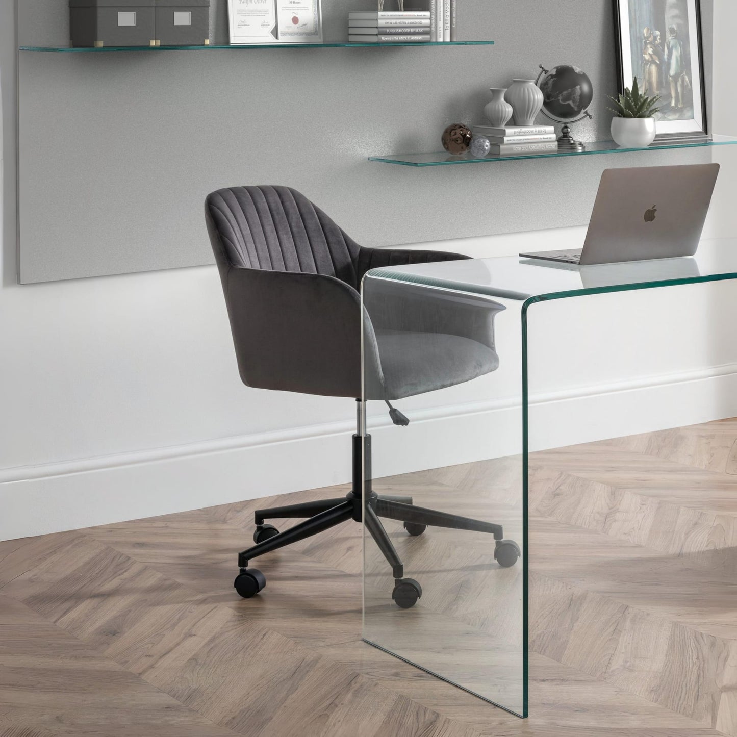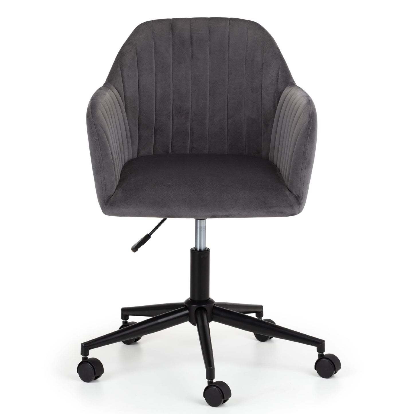 Finished in soft velvet, the Kahlo swivel office chair features a filled seat with a curved backrest, giving a beautiful look as well as maximum comfort. The height adjustable gas lift mechanism and wheeled swivel base provides practicality, whilst the pleated back adds to the traditional art deco design. Available in two beautiful colour options of blue or grey.
