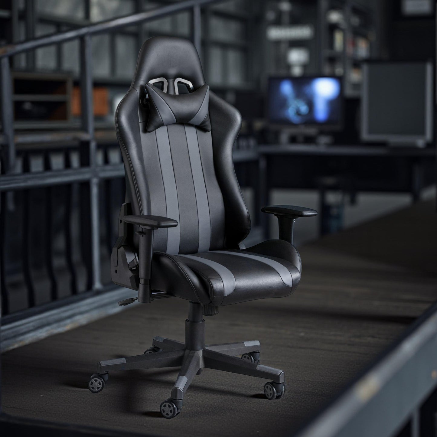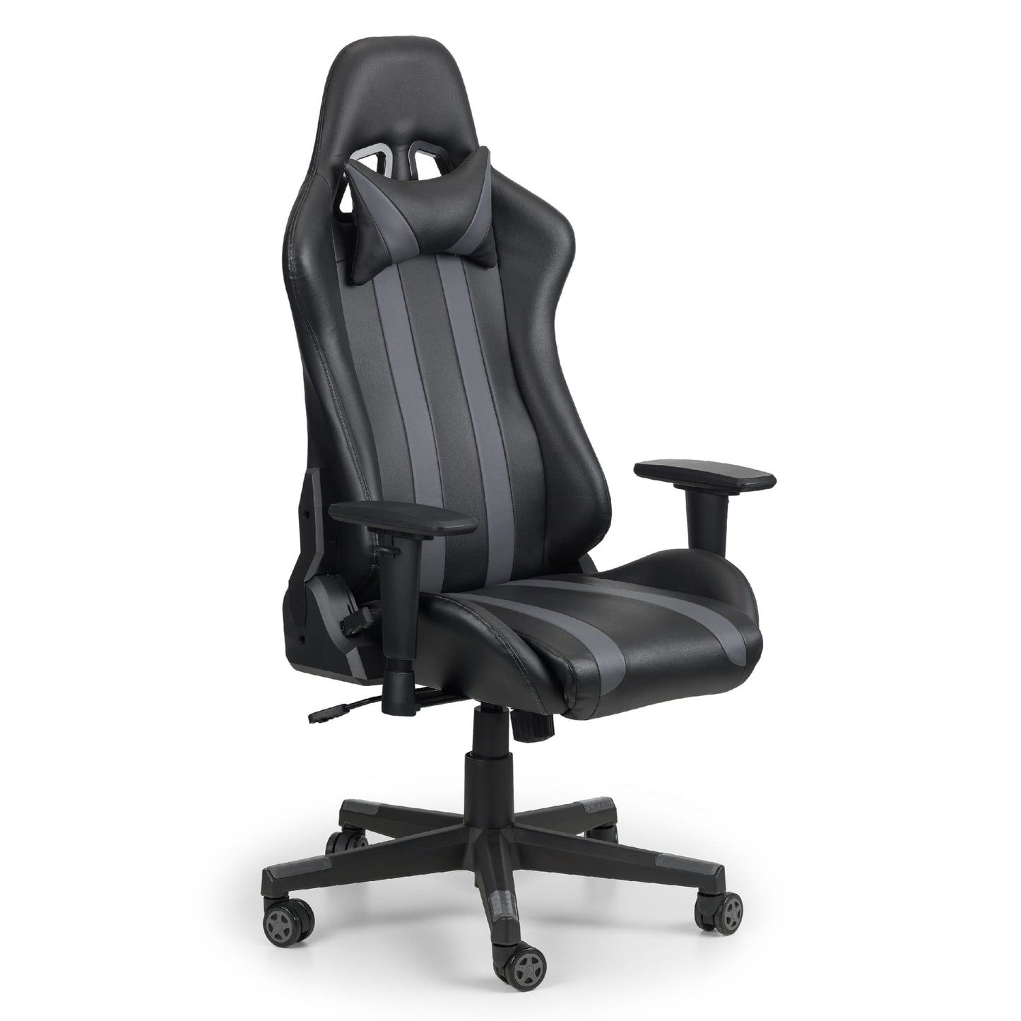 Finished in a black faux leather with striking grey accents, the Meteor Gaming Chair features a high back with a head pillow, offering full back and neck support. This Chair can be fully adjusted including the armrests, allowing you to get into your best position for your hours of game play. Easily move around on the Meteor gaming chair upon its 5 castors, suitable for gamers or those spending long days at a desk.
