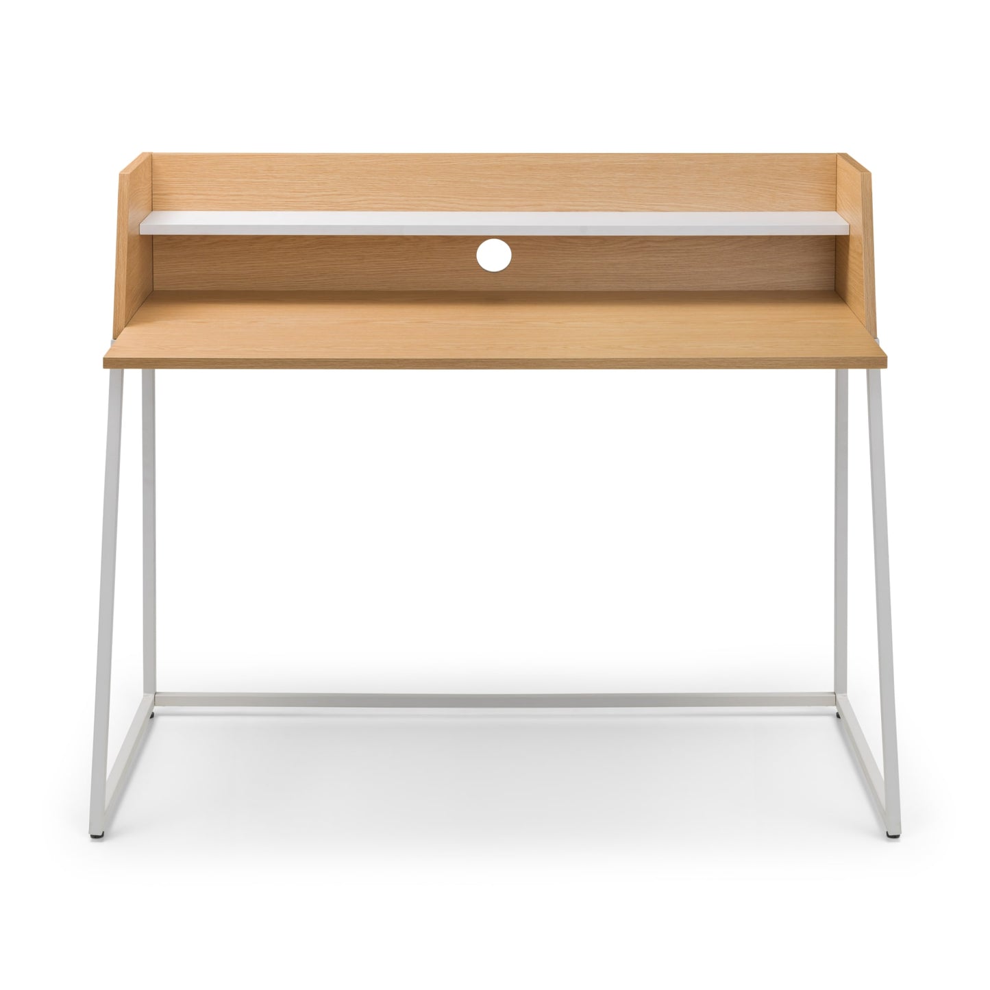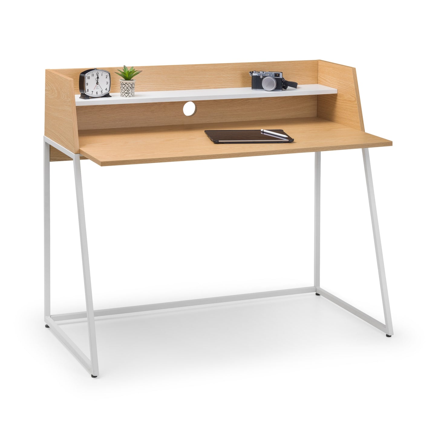 The Palmer Desk offers a simplistic, functional design. Offering a large surface area for your laptop and paperwork, along with an additional shelf for your stationary. This desk offers a space for your wires to sit neatly down the back of the desk, allowing you to keep your workspace tidy. Finished in an oak effect with a contrasting white shelf and legs, this desk suitable for a wide range of décor.