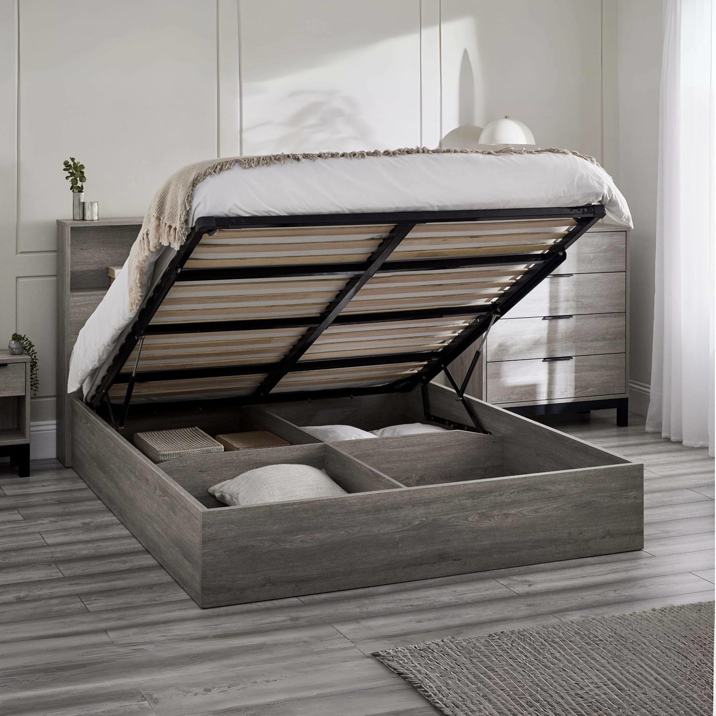 Enhance your bedroom with the Bali Ottoman Storage Bed in Grey Oak, a perfect blend of sophistication and practicality. This innovative bed offers a spacious under-bed storage solution, ideal for keeping your bedding, clothing, or other essentials neatly tucked away. The sleek design, combined with a contemporary grey oak finish, brings a touch of elegance to your space while maximising functionality. Crafted with Click Furniture Technology, it ensures effortless assembly and disassembly, making it ideal for those who value both style and convenience. Mattress sold separately.