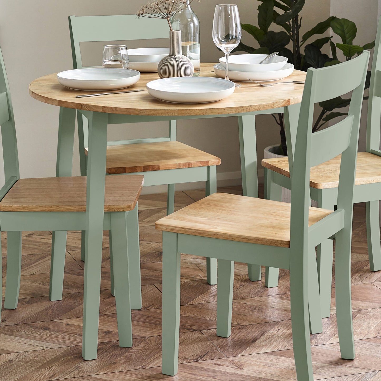 Make the most of your space with this beautifully designed round drop-leaf dining table, perfect for everyday meals or relaxed weekend brunches. Featuring a warm natural oak-effect top and a soft sage green base, it blends classic charm with modern practicality. The drop-leaf extension system offers extendable leaves that provide ideal extra surface for any occasion and adjusts the table length from 55cm to 90cm. Whether styled as a compact kitchen table or a space-saving dining table, this versatile piece fits effortlessly into any room while delivering both function and character. Assembly required. Chairs sold separately.