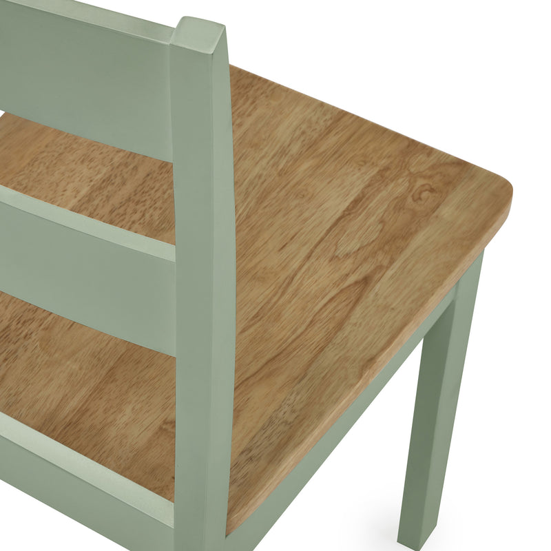 Add a charming touch to your dining space with a set of two sage green and natural oak effect dining seats. Featuring a timeless slatted back and gently curved top rail, they combine comfort and classic style, perfect for everyday meals or special gatherings. The oak-effect seat offers a warm contrast against the soft sage green frame, creating a cosy and inviting look that complements a variety of interior styles. Table sold separately. Easy self-assembly required.