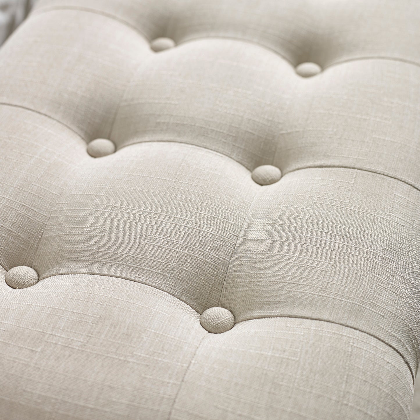 - COMFORTABLY PADDED BUTTON TUFTED SEAT: An upholstered seat that adds a layer of visual detail while offering a supportive place to sit, perch or lay out cushions and throws.