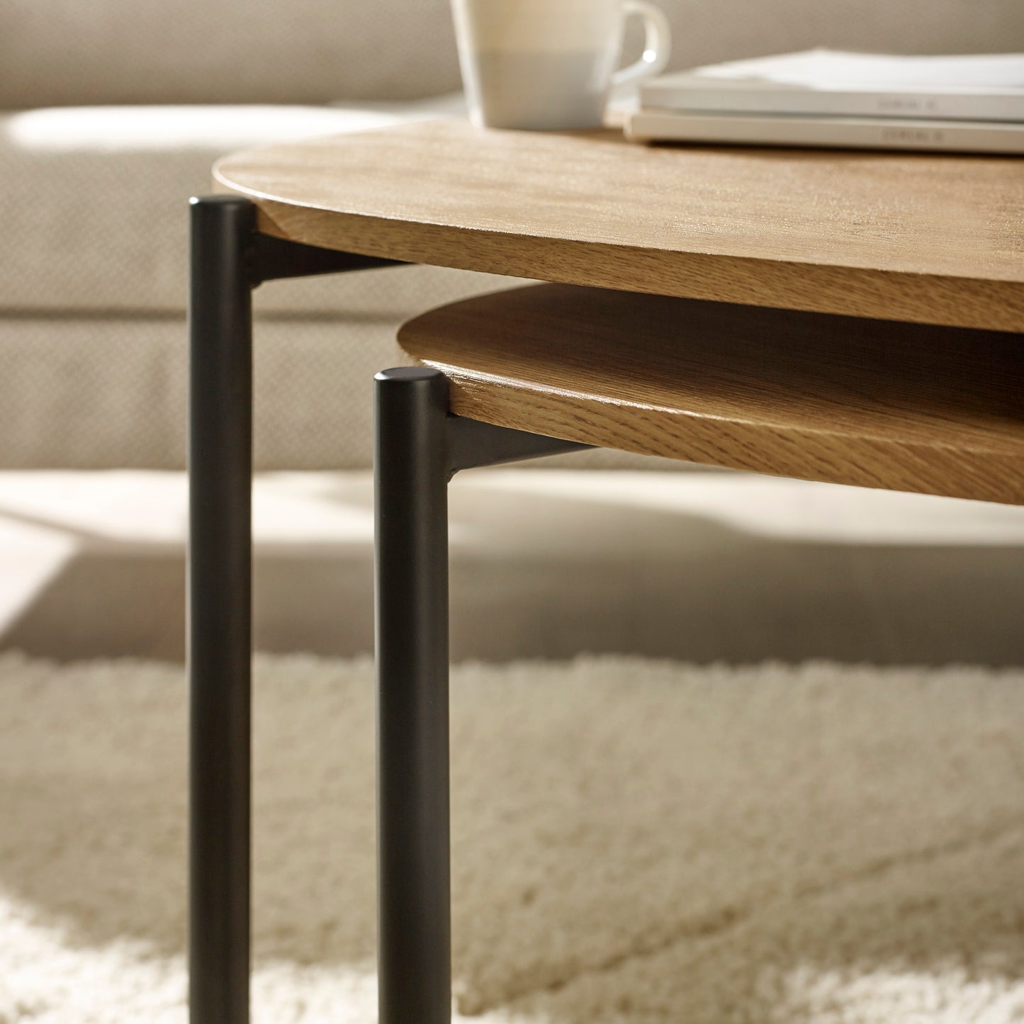 "The Lorette Black Ash effect Coffee Tables bring sculptural simplicity and contemporary contrast to your living space. Featuring softly organic, overlapping teardrop shaped tables in richly grained black ash effect, the design feels both modern and effortlessly refined.