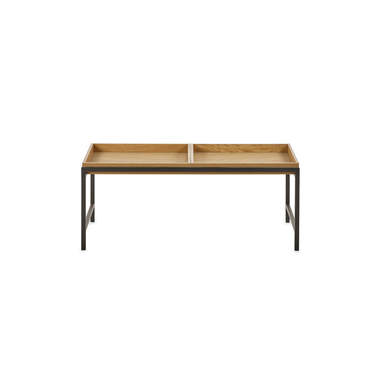 Refresh your living room with this sleek tray-style coffee table, blending contemporary design with a warm, natural finish. The wood-effect top adds texture and character, while the open black metal frame keeps the look light and airy. The trays can be easily flipped or removed, offering flexible use and added convenience. With subtle raised edges to keep items secure, it’s perfect for drinks, books, or decorative accents. Self-assembly required.