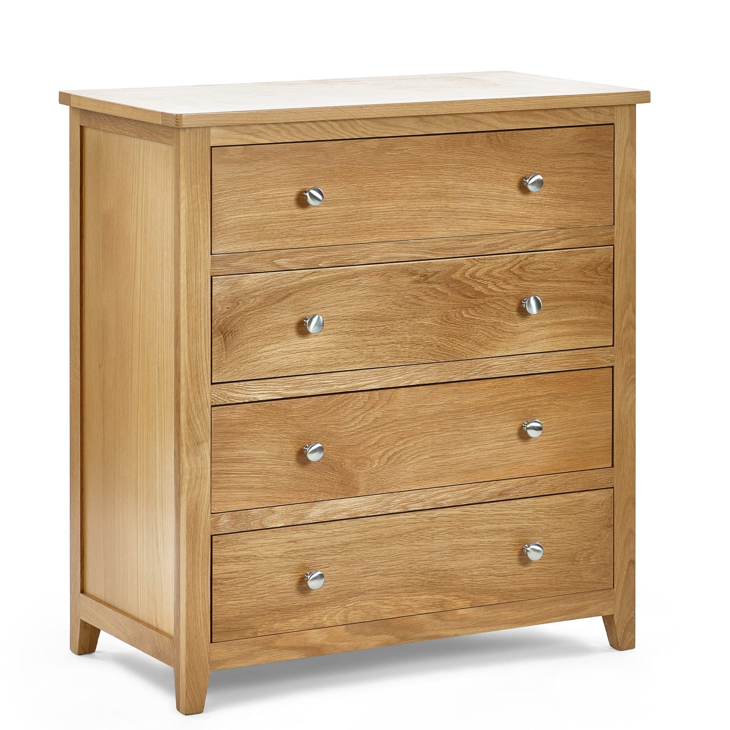Crafted from solid oak and oak veneers, the Mallory 4 Drawer Chest features 4 generously sizes drawers ideal for storing clothing. The simple, yet stylish design with beautiful silver knobs perfectly complements any bedroom decor.