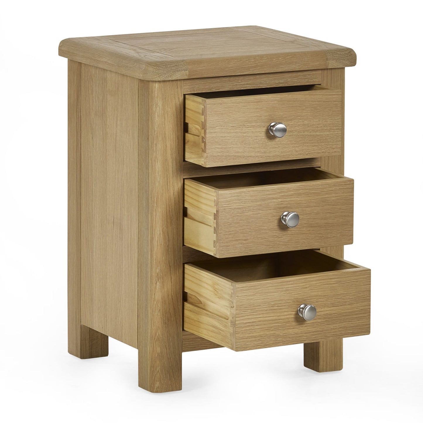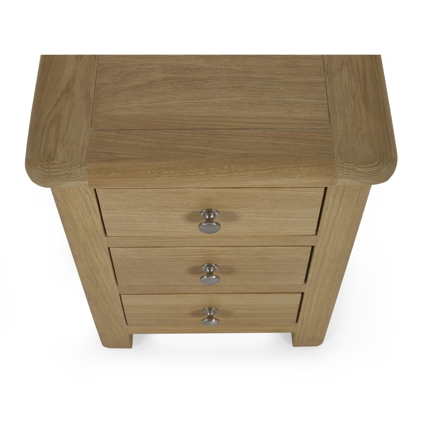 The Memphis 3 Drawer Bedside is finished in a gorgeous limed oak, providing a smooth curved edging that will add a timeless look to any bedroom space. This sleek design features three pull-out drawers offering storage space for key necessities at hand reach which are elegantly finished with bulbous polished silver handles.