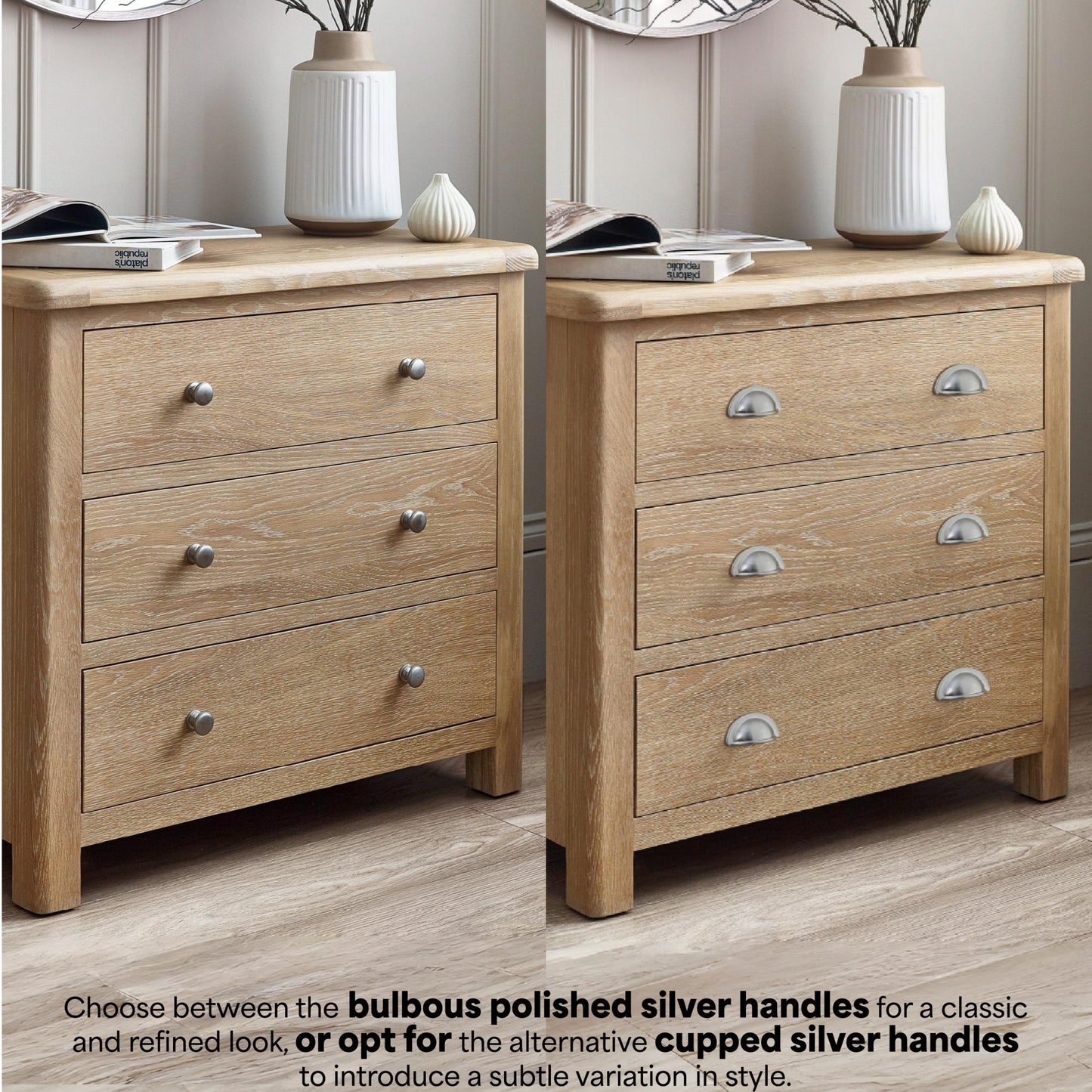 The Memphis 3 Drawer Chest is finished in a gorgeous limed oak, providing a smooth curved edging that will add a timeless look to any bedroom space. This sleek design features three pull-out drawers allowing perfect ample storage space for clothing and bedding which are elegantly finished with bulbous polished silver handles.