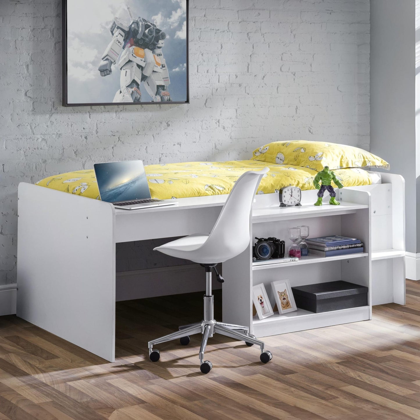 The Neptune Midsleeper offers a compact space saving design with a fresh and minimalist look in a white finish, suitable in both boys and girls bedrooms. Featuring a desk and 2 large shelves, along with additional underbed storage to free up some floor space for books, toys and more. Crafted from sturdy particleboard with foil, this bed has a wooden slatted base and fits a UK single mattress
