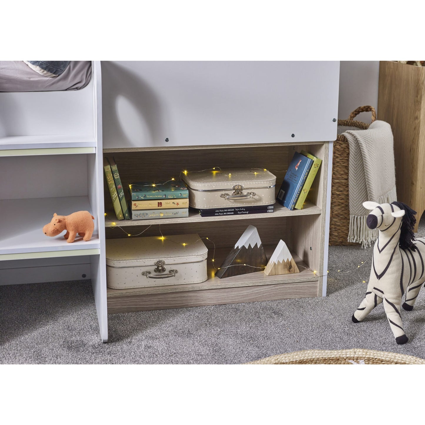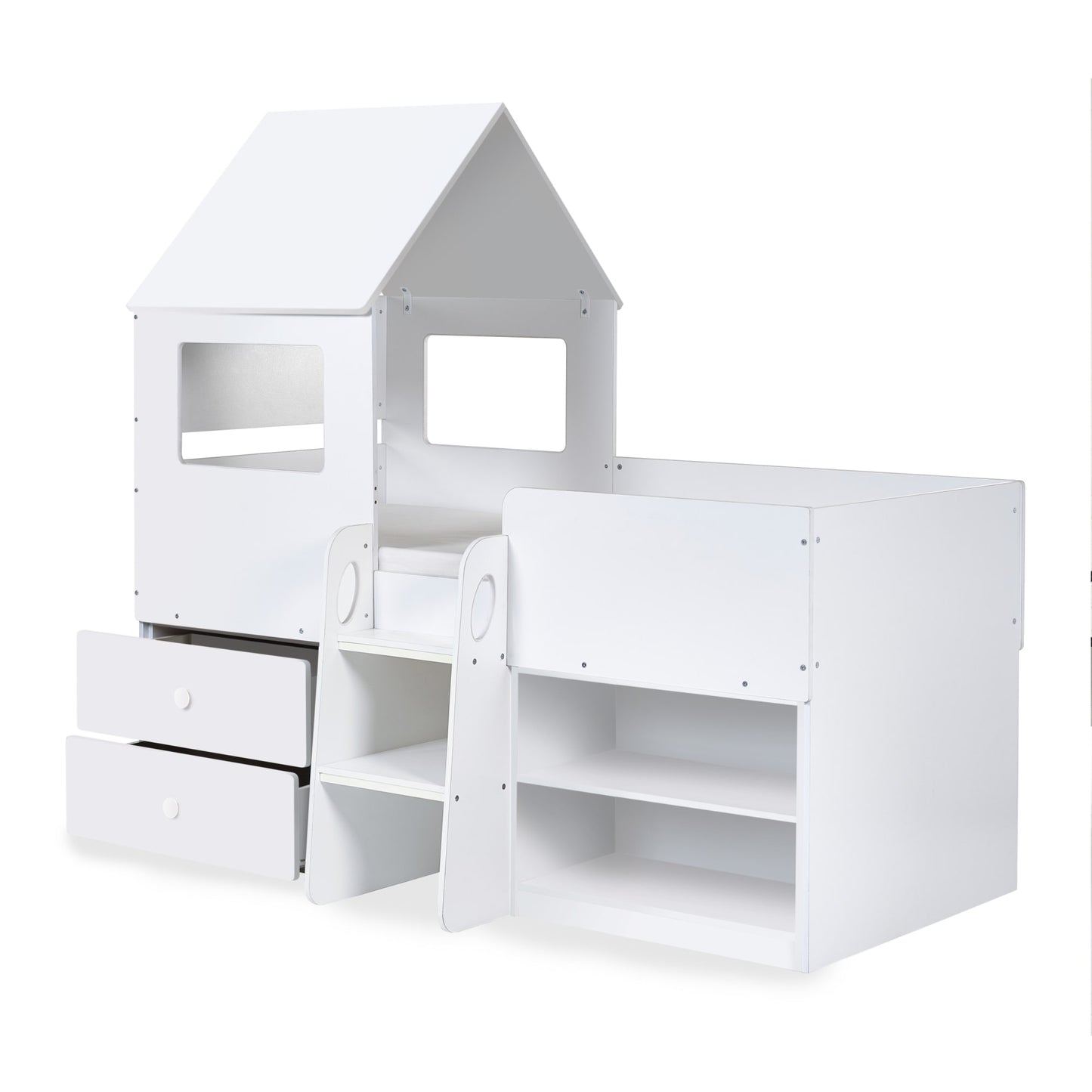 Transform bedtime into a magical adventure with the Orpheus Midsleeper, a delightful house-style bed designed to capture the imagination of your little ones. Finished in white, this enchanting bed features two pull-out drawers and open shelving, creating ample space for toys and necessities. The two-step study glow-in-the-dark ladder adds a playful touch, leading to the cozy haven on top complete with a wonderful roof and two opened windows on each side. Give your child the perfect dream bed they've always imagined.