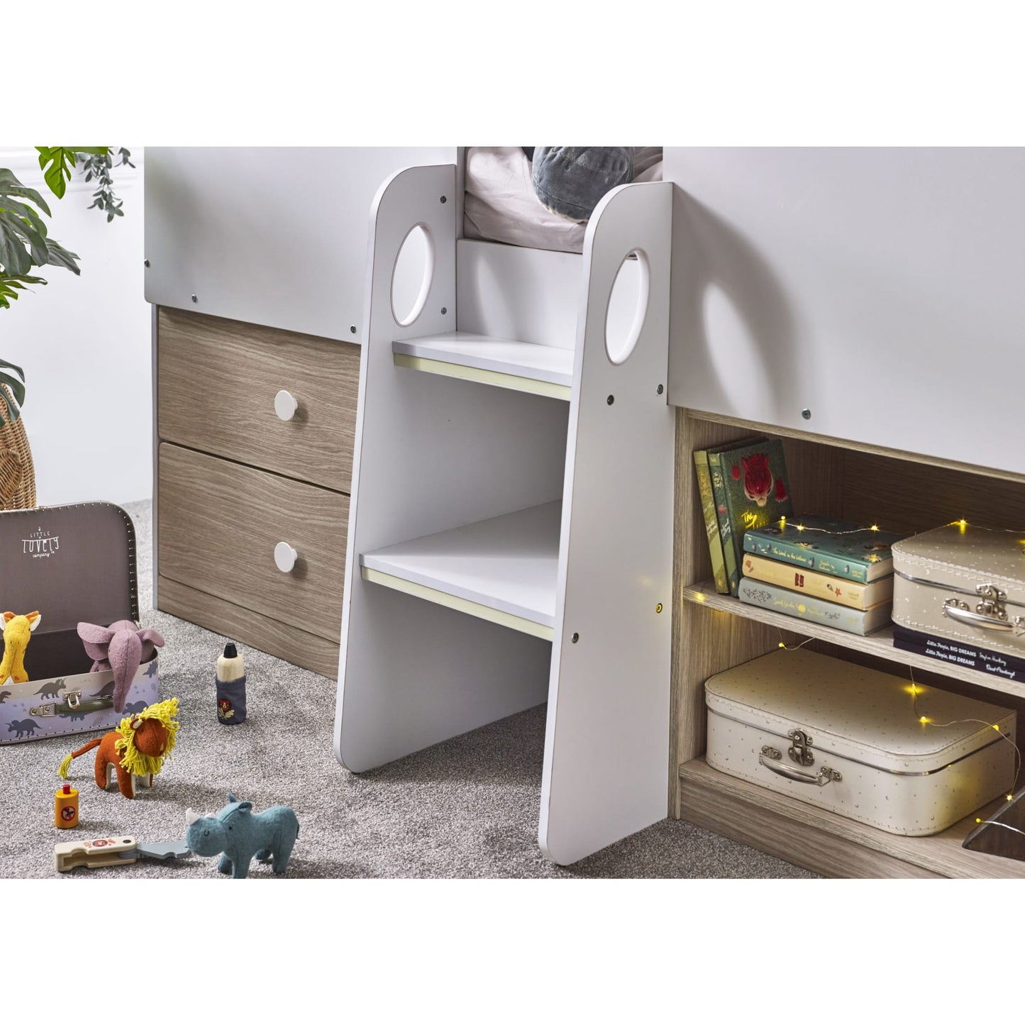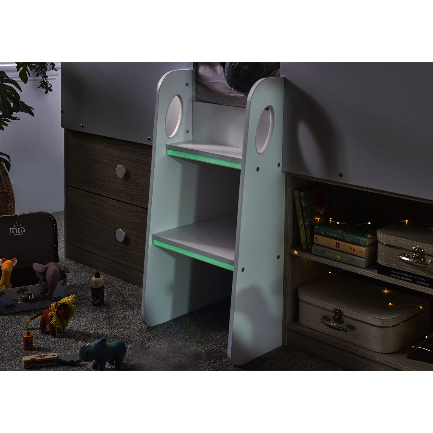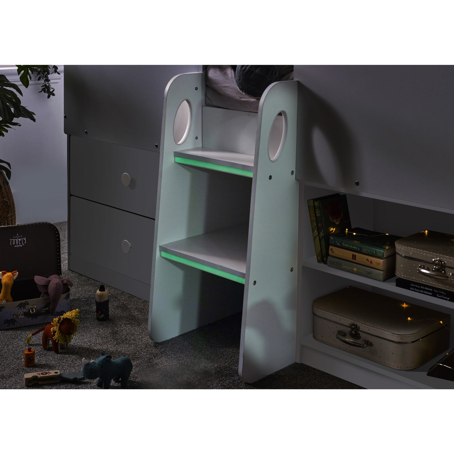 - The two-step study ladder with glow-in-the-dark accents adds a playful touch to bedtime adventures.