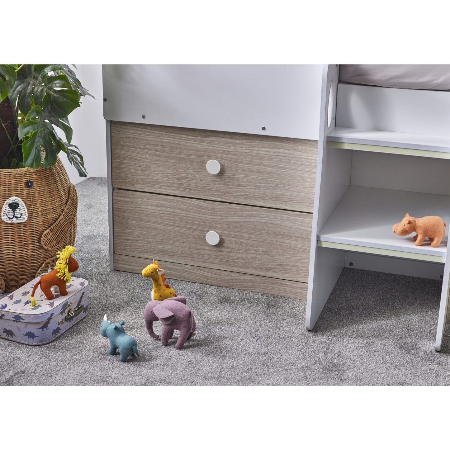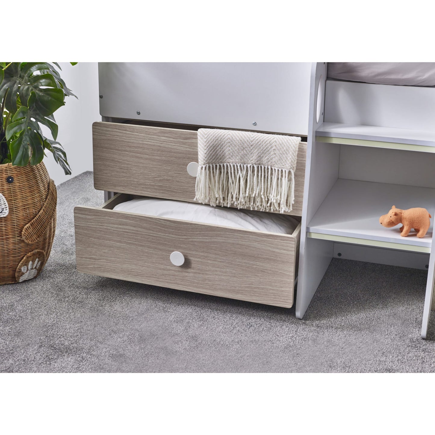 - Equipped with two pull-out drawers and open shelving, providing ample space for toys and necessities.