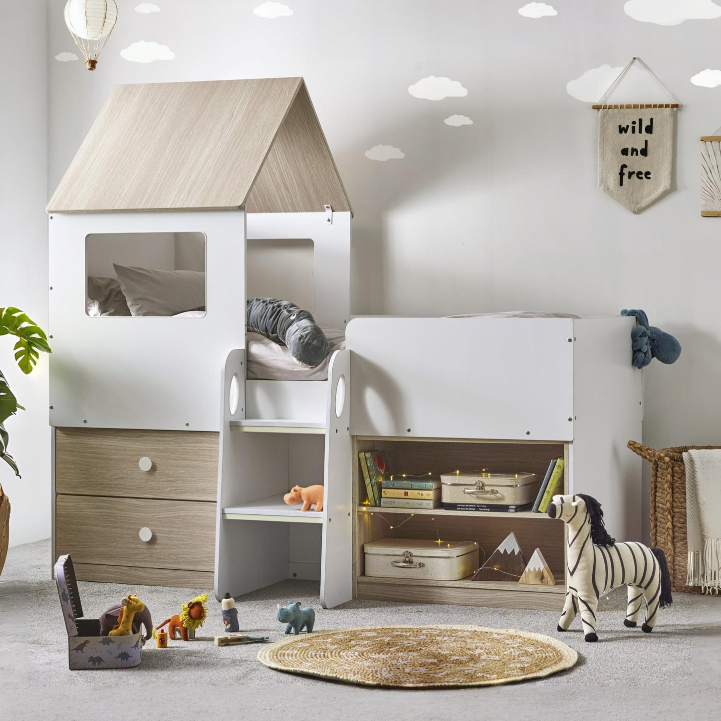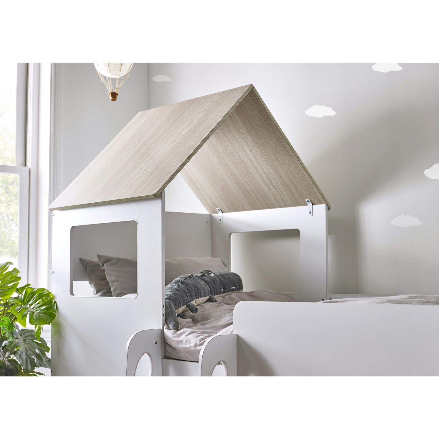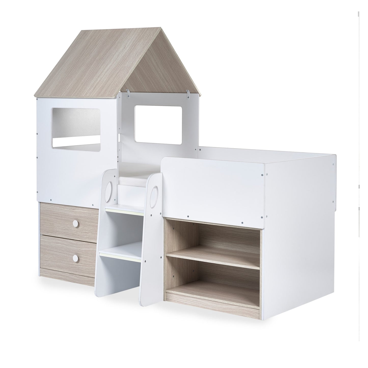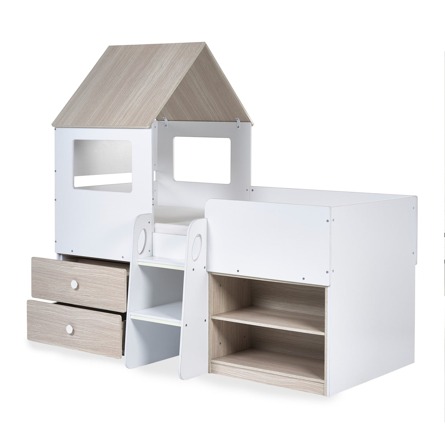 - Captures your child's imagination with a charming woodgrain and white finish in a magical house-style bed.