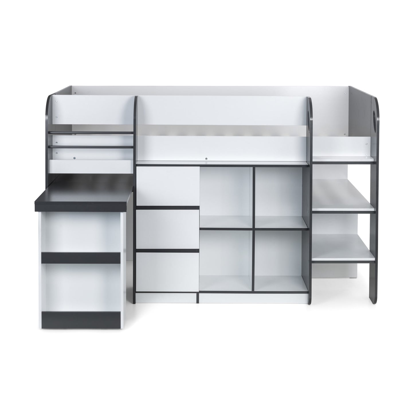 • Space-Saving Design: Elevated single sleeper with integrated desk and ample shelving, perfect for compact living spaces. Ideal for kids’ rooms, combining sleep, study, and storage in one.