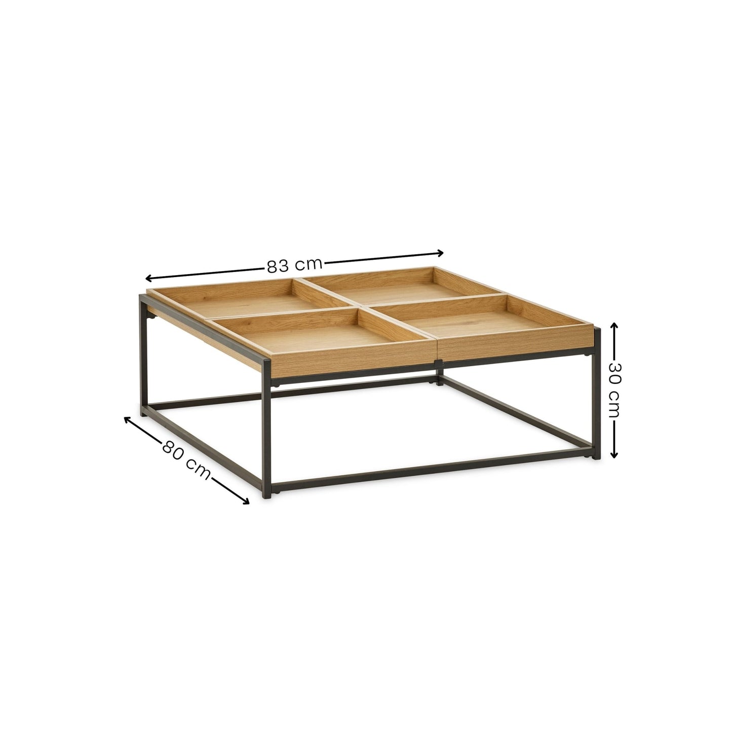 Add style and functionality to your living room space with this contemporary square tray coffee table. Finished in warm light oak effect, it features four removable tray-top covers. It features four removable tray-top covers. Each tray can be used flat as a standard coffee table surface, flipped to create a raised-edge tray, or lifted away completely to double as a serving tray for drinks, snacks, or even breakfast on the sofa. The slim black metal legs provide sturdy support while adding a sleek, modern contrast to the natural wood tones. Partial assembly required, just attach feet.