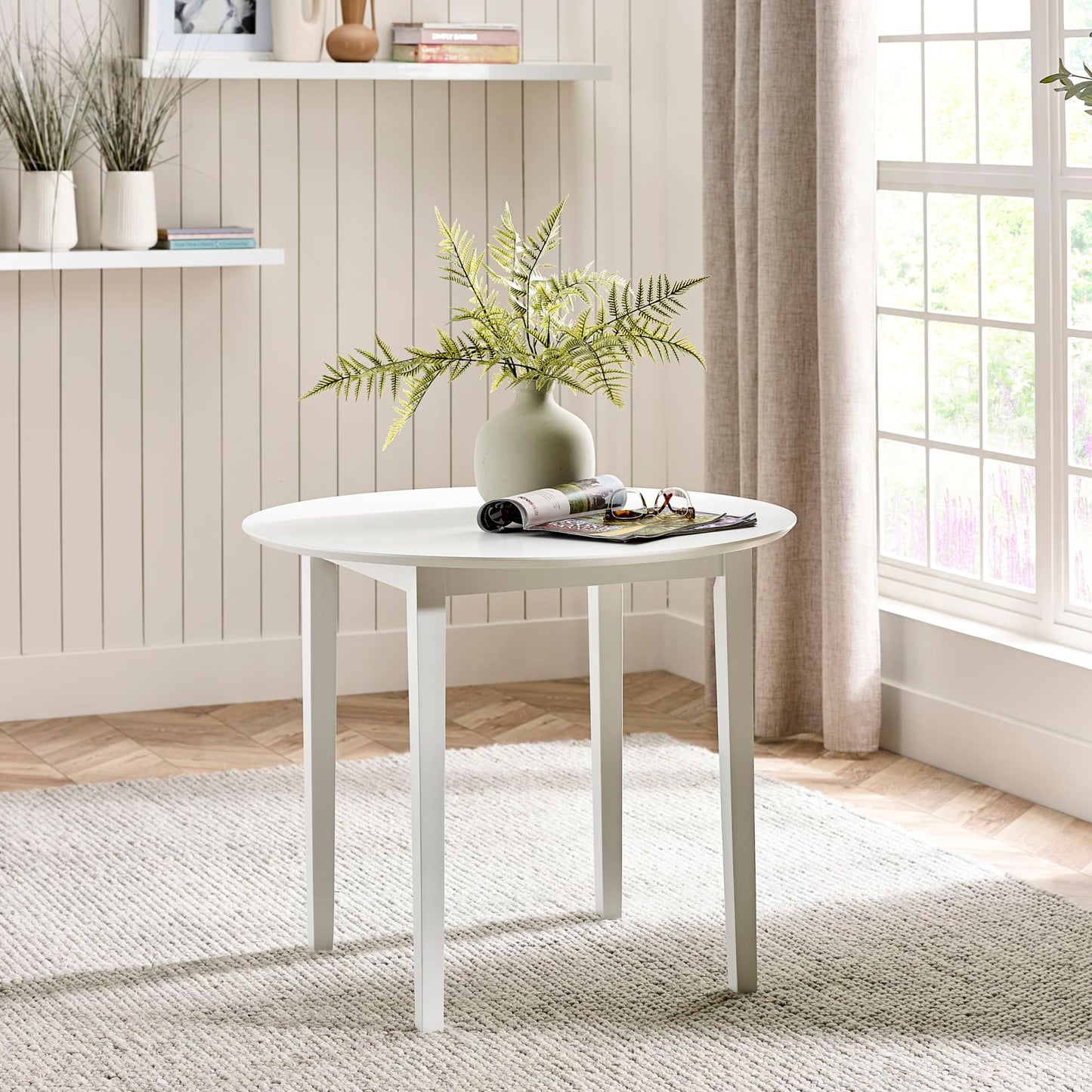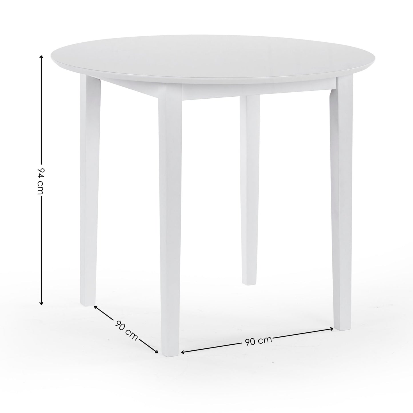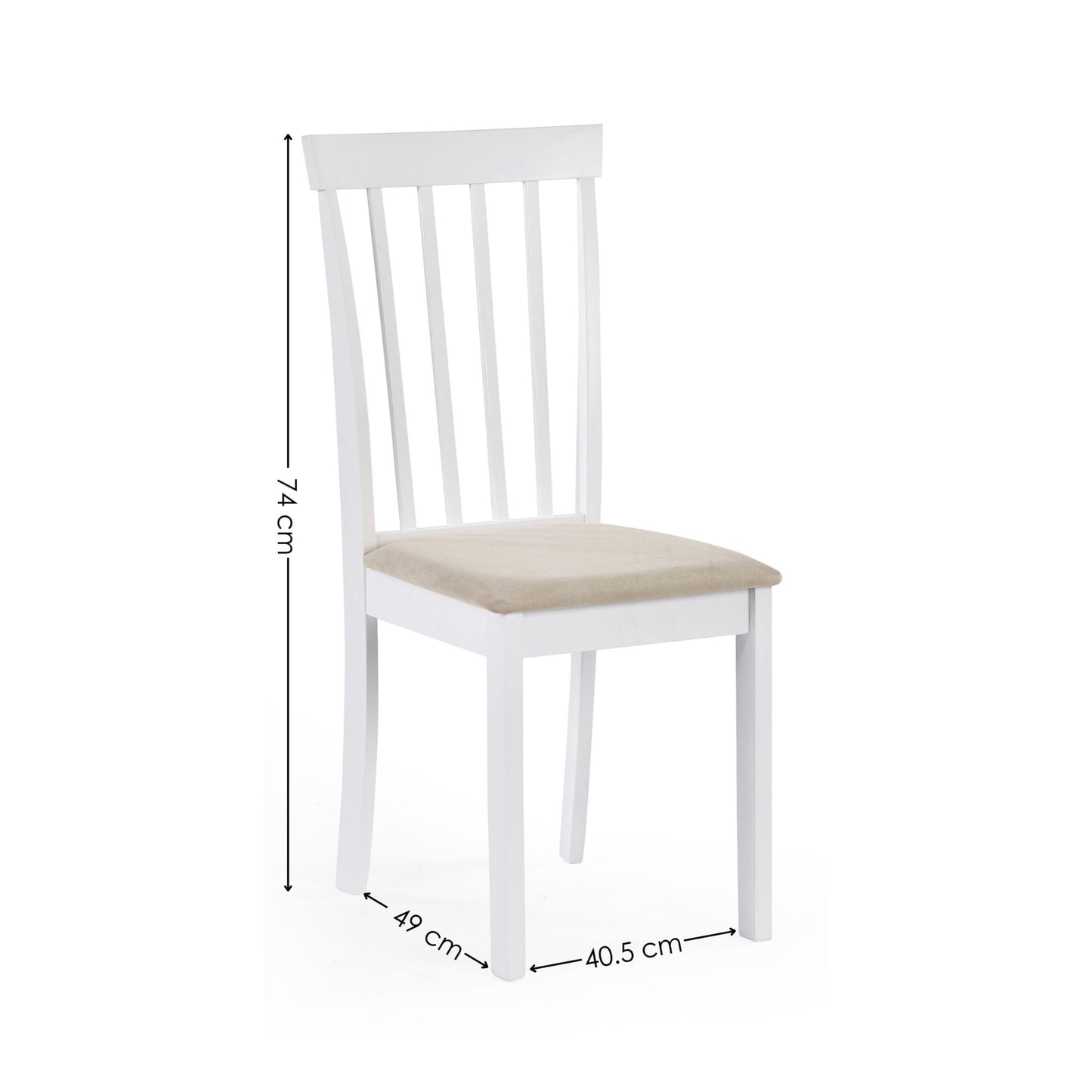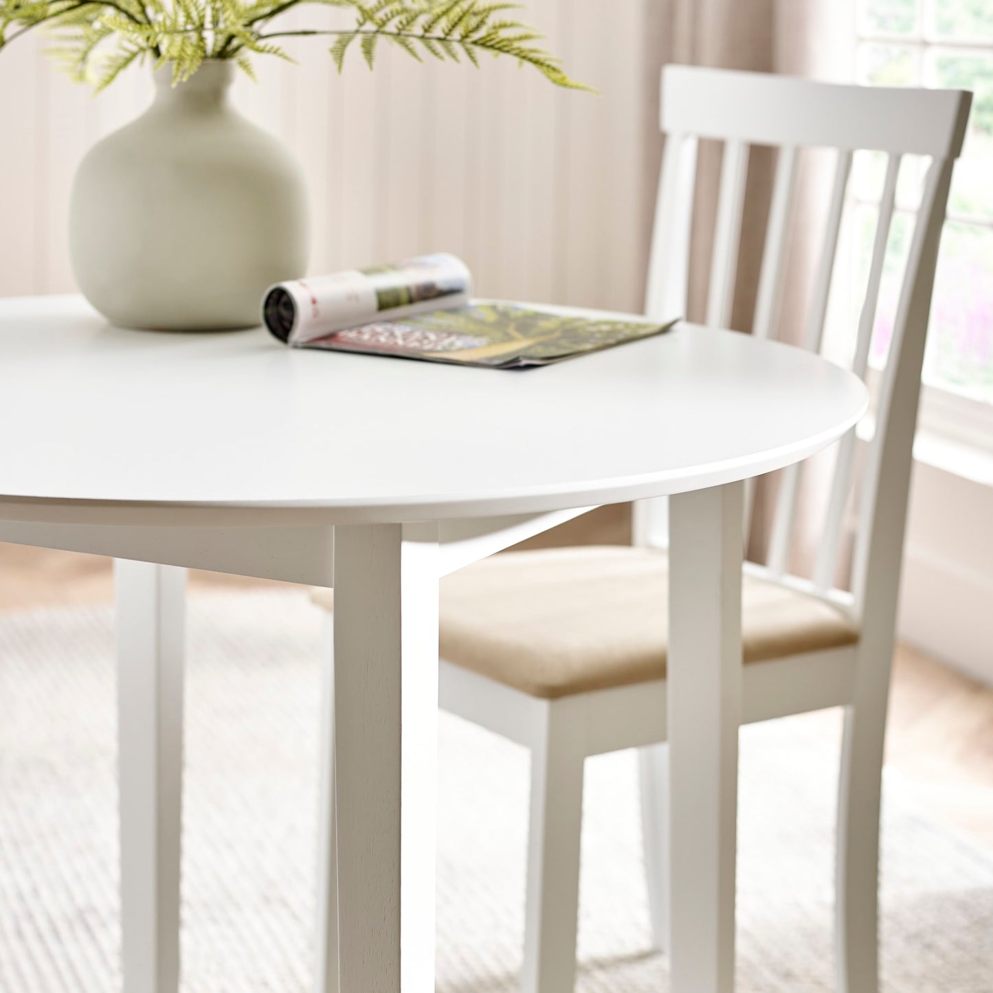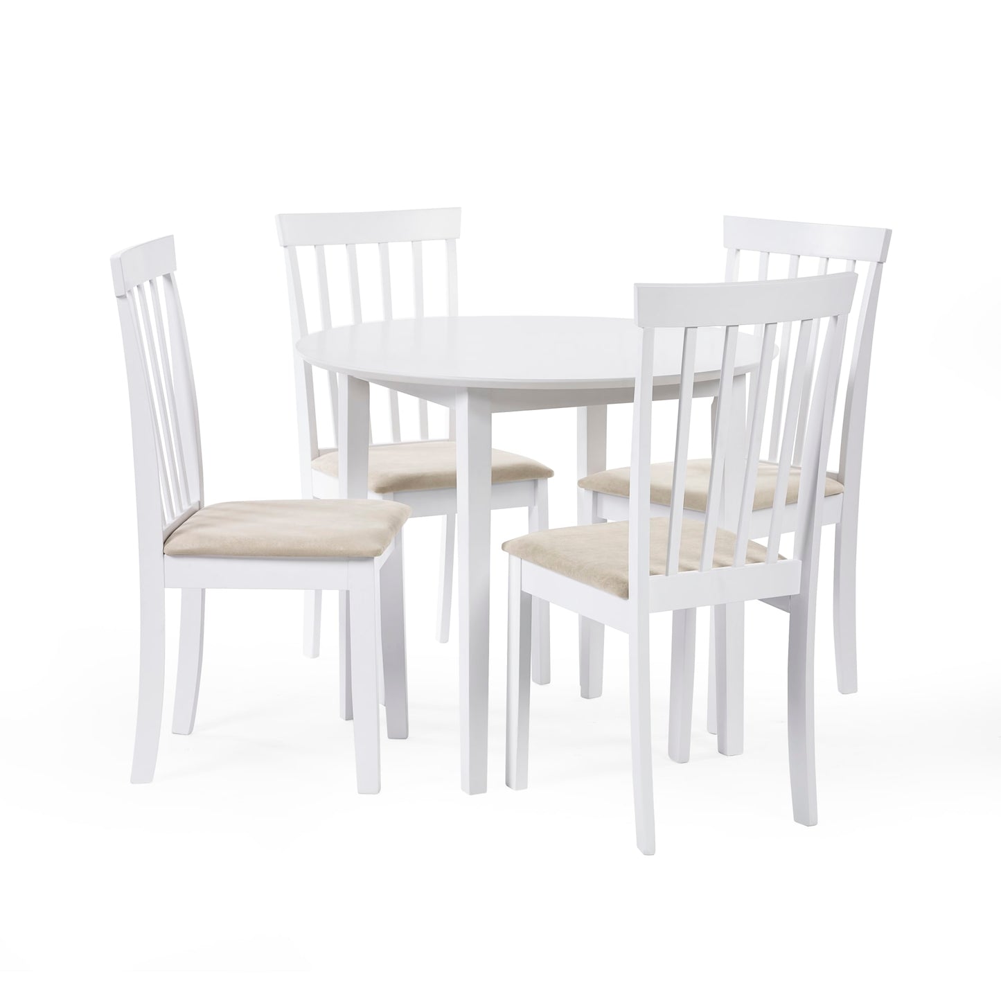 Brighten your dining space with this elegant round dining set in crisp white. The compact table pairs beautifully with four matching chairs finished in white and topped with soft beige upholstered seats for added comfort. A classic slatted back design gives the chairs a timeless, structured look, while the smooth round tabletop creates a welcoming setting for casual meals or intimate gatherings. Perfect for kitchens or smaller dining rooms, this set combines function and charm effortlessly. Easy to assemble for everyday use.