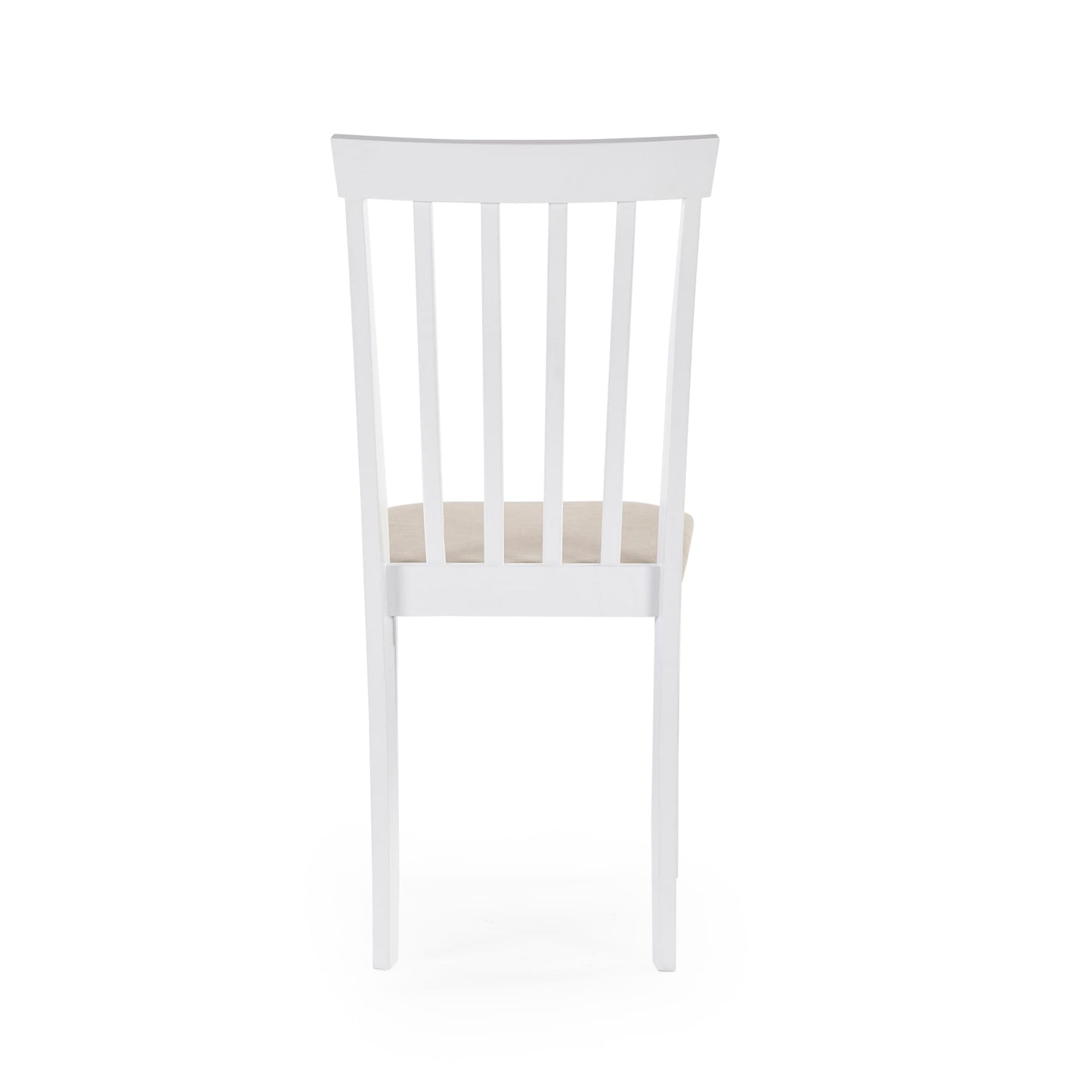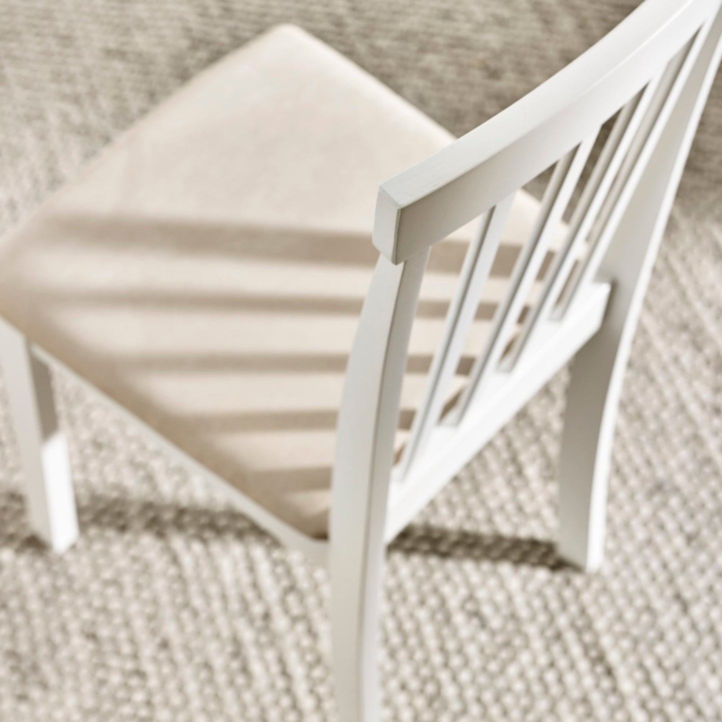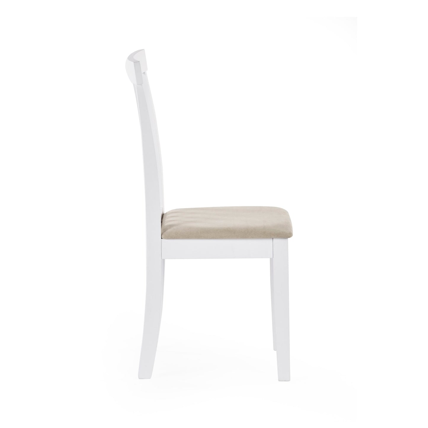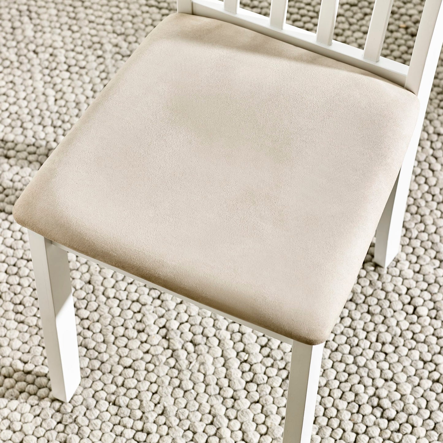 - COMFORTABLE SEATING: Soft beige upholstered seats pair beautifully with the fresh white finish.