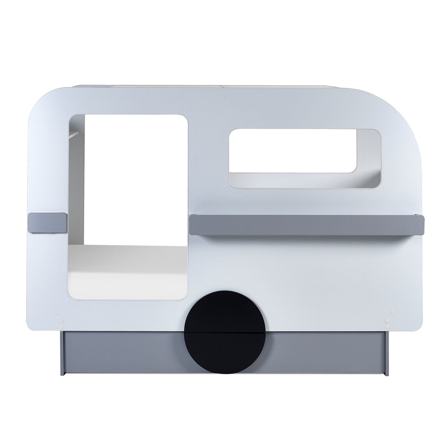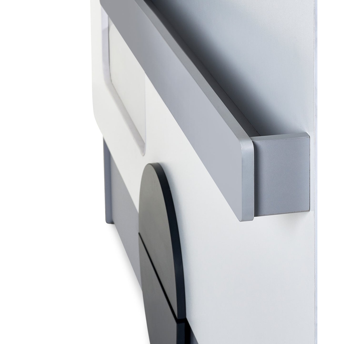 Escape, Enjoy, and Sleep! Let your little one's imagination go wild and experience traveling around in our wonderful Tourer Cavan Bed. With its unique Caravan shape, the Tourer bed offers shelves from both the inside and front perfect for storing books and toys. As well as a pull-out drawer at the bottom bed for storing away all the essentials from blankets to toys. Finished in lacquered white, grey, and black round-shaped wheels. Creating the perfect adventures for your younger ones.