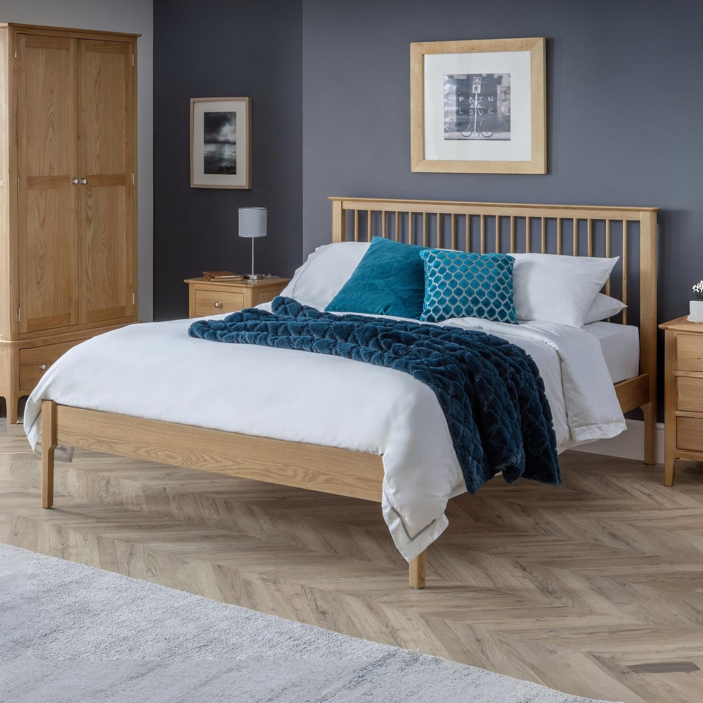 Promising to provide both comfort and quality for many years to come, the Cotswold Bed boasts a traditional shaker design. Crafted from solid oak and oak veneers with wooden slats for maximum mattress support, this bed acts as a beautiful focal point for any bedroom with its timeless design. Available in 135cm Double and 150cm King, part of the Julian Bowen Cotswold Bedroom Collection.