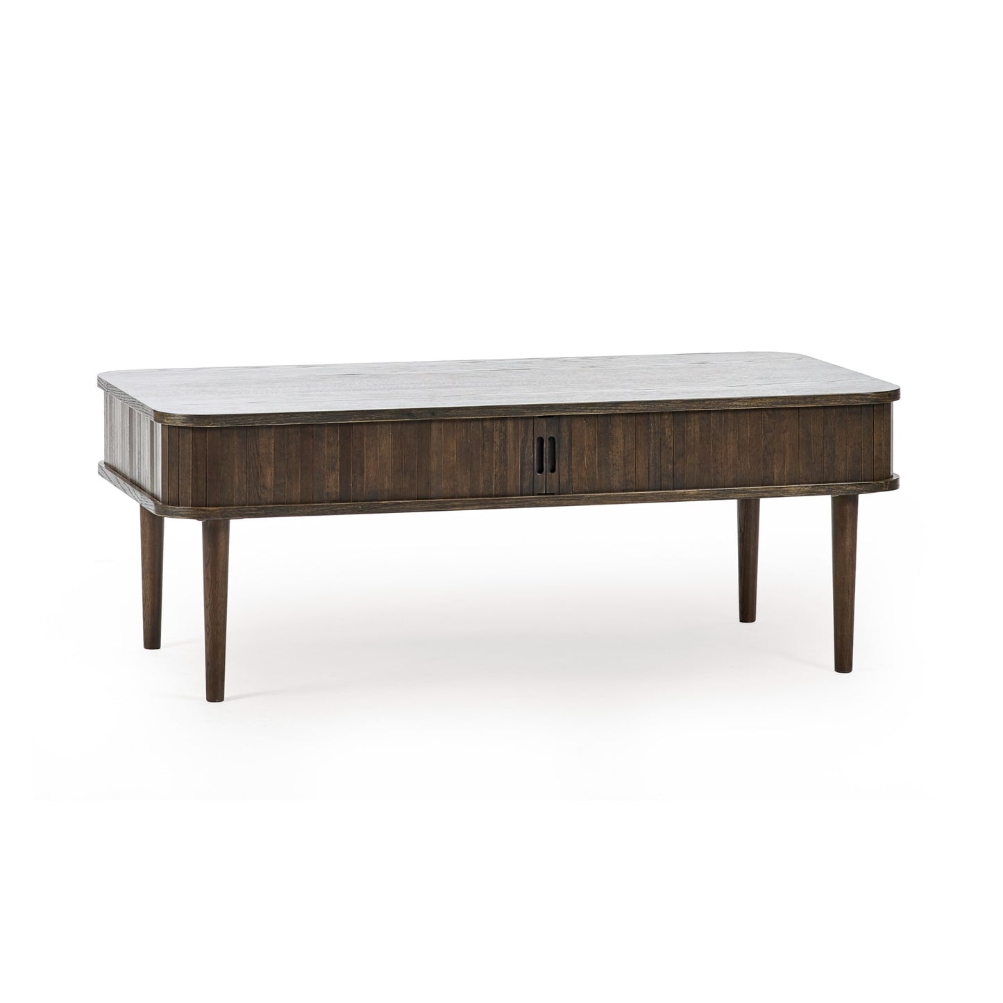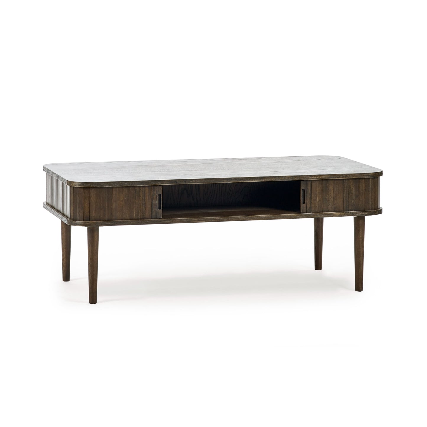 Bring a touch of modern elegance to your living room with the Arya Coffee Table. Finished in a rich dark oak effect, it brings warmth and sophistication to any living room. The slatted sliding tambour doors open to reveal a hidden hollow storage space, perfect for keeping your essentials neatly tucked away. With sleek cut-out handles and four Nordic-style legs, this piece adds a minimalist touch while enhancing your home’s functionality. Ideal for storing or showcasing decor and storing items, making it a standout addition to your living space. Simple assembly required, making it quick to set up and enjoy.
