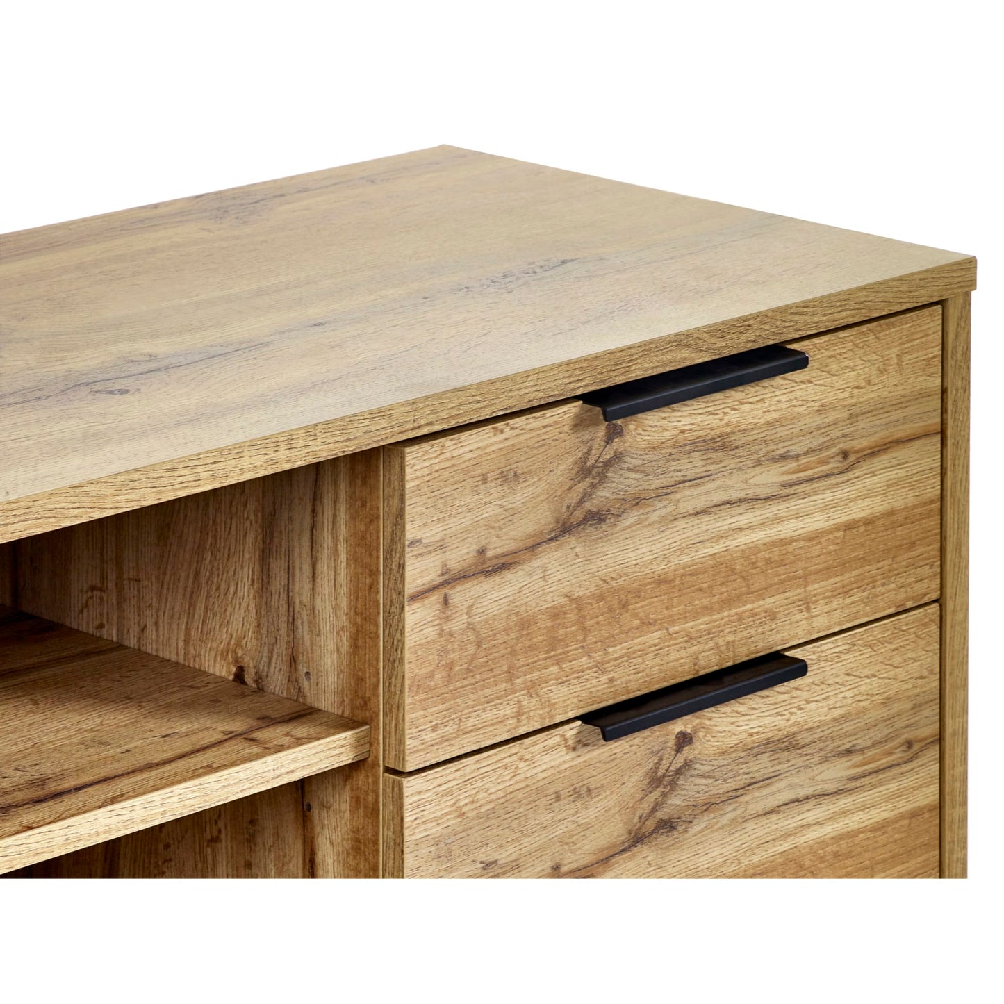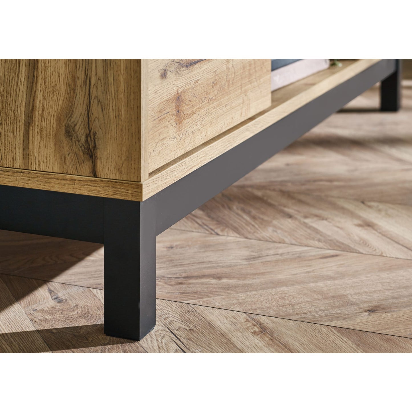 Discover the seamless blend of style and simplicity with the Bali TV Unit in Grey Oak. Crafted using revolutionary click furniture technology, this unit seamlessly combines high-quality craftsmanship with effortless assembly. The modern grey oak finish, complemented by contrasting black legs and handles, brings a classic industrial aesthetic to your living room. Featuring a spacious cupboard and two pull-out drawers for organised storage, along with center shelving for additional storage and display options.