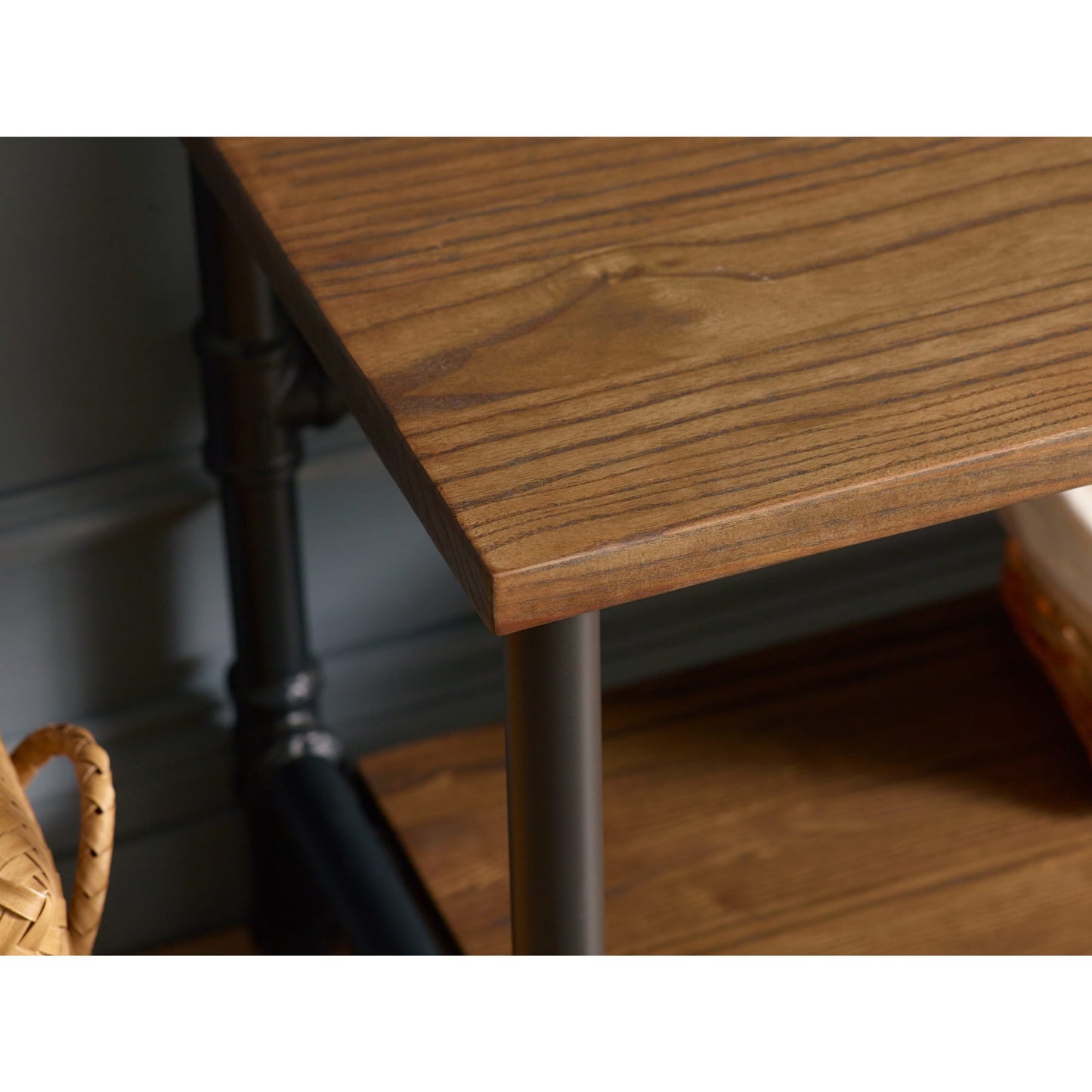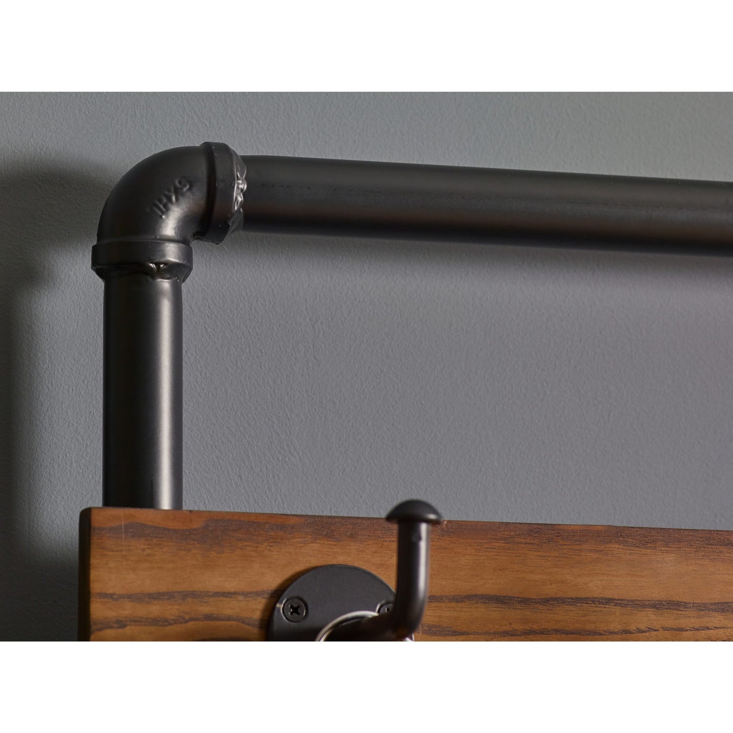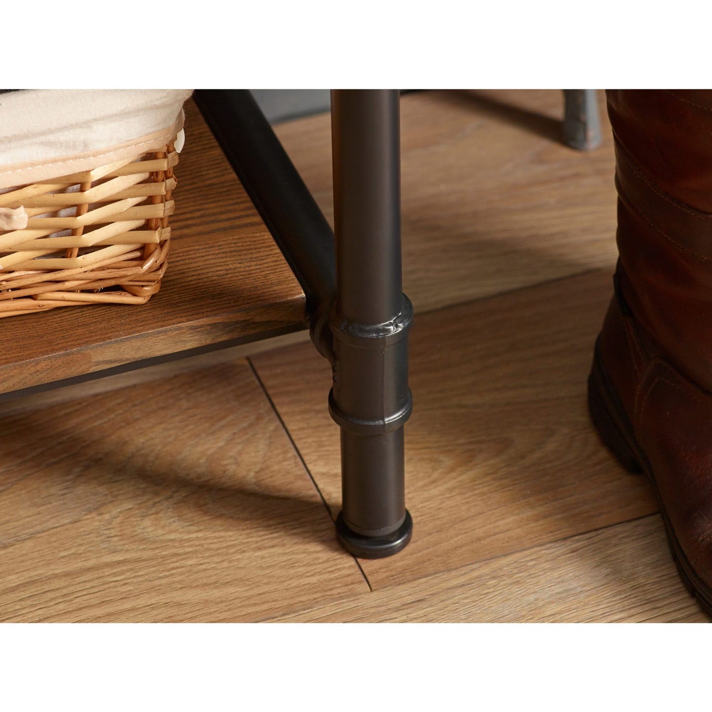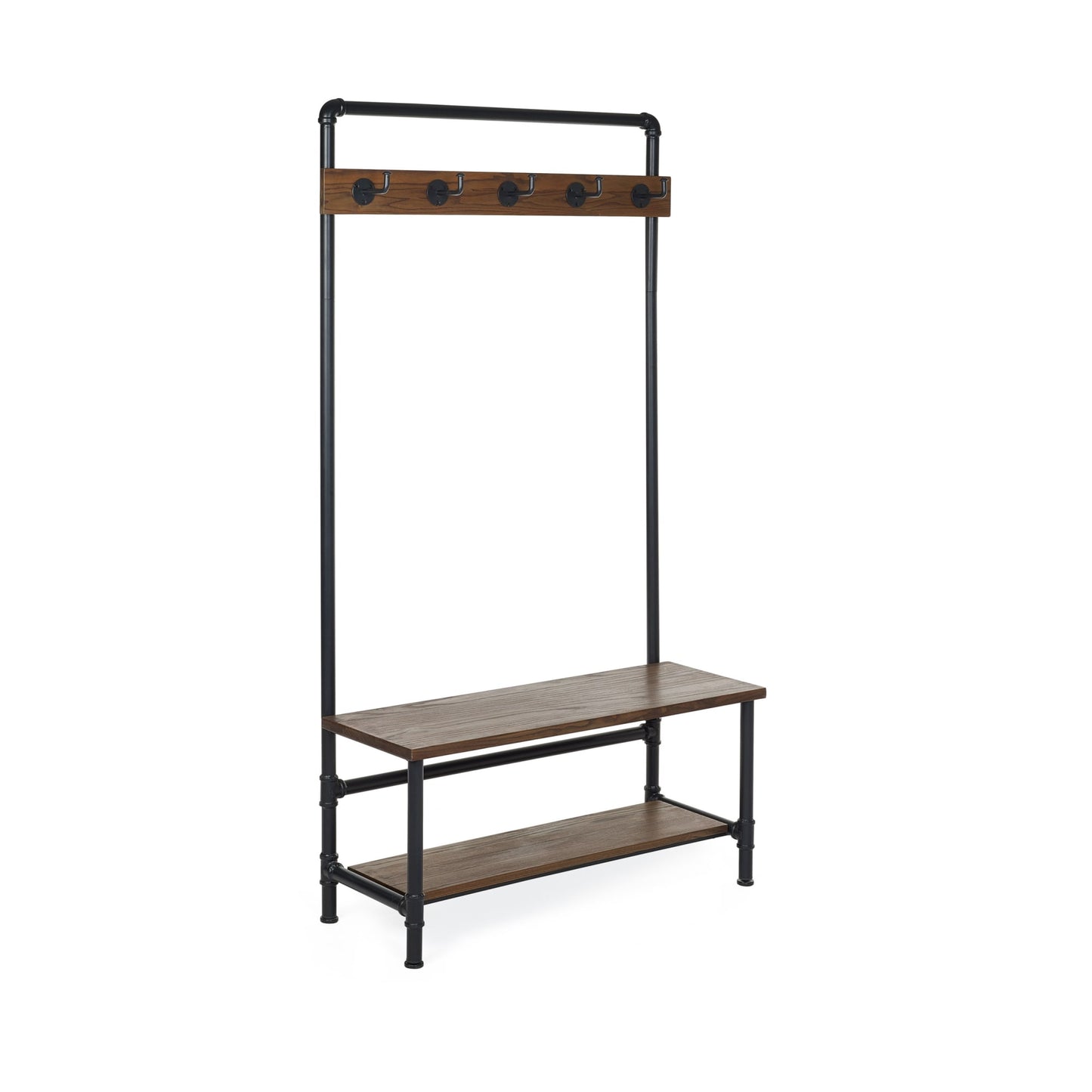 Make a statement in your entryway with the Boston Hallway Stand with Bench, seamlessly blending industrial design with practicality. Boasting sleek pipe legs crafted from powder coated steel for a modern touch to your home decor. With five black hooks provided, it is perfect for keeping coats and bags within easy reach. The built-in bench constructed from solid Elm wood in a luxurious mocha finish, and offers a cosy spot to sit whilst slipping on shoes, with ample storage space underneath for footwear and other essentials. Welcome guests in style with this chic and versatile addition to your home. Minimal assembly is required for your convenience.